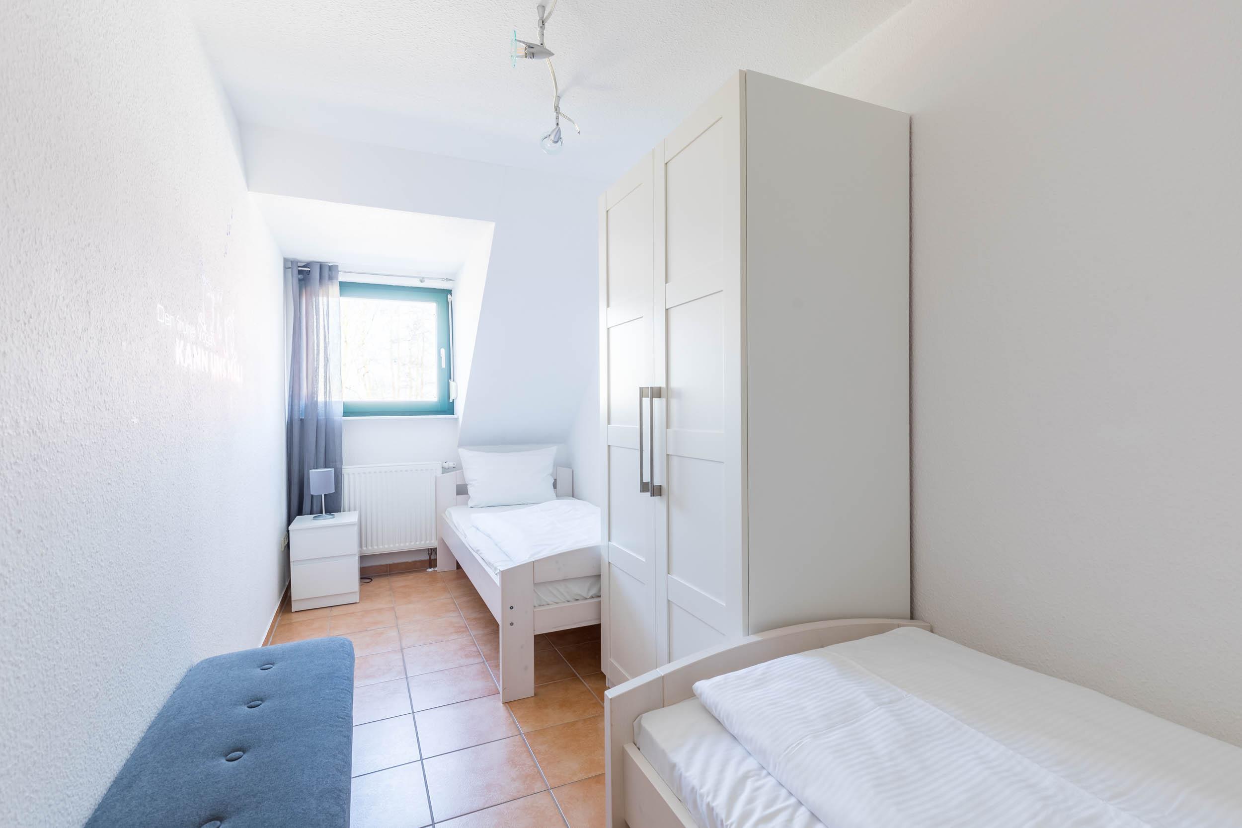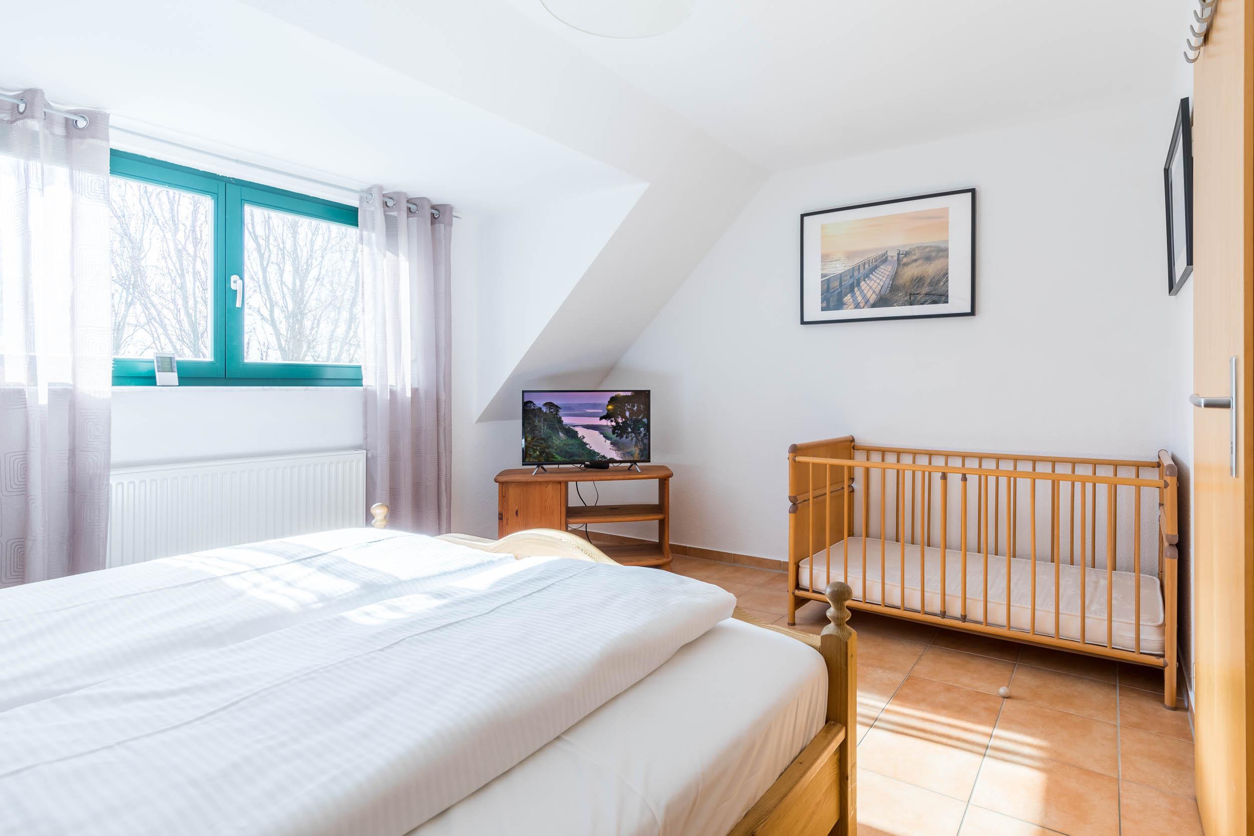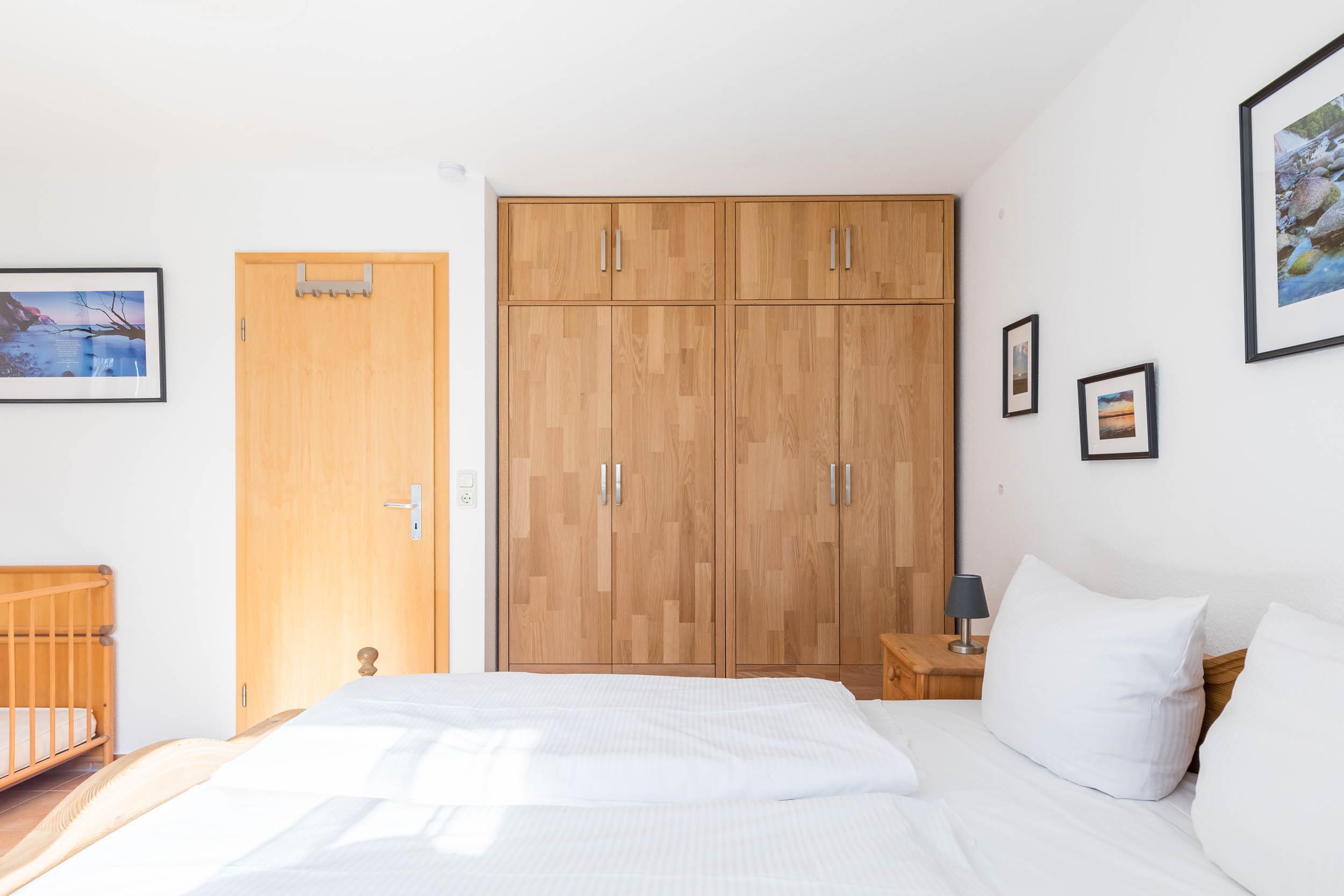 Hier, im 1. Obergeschoss, erwarten Sie ein großzügiges Schlafzimmer mit Doppelbett und großem Kleiderschrank, einem festen Holzgitterbett mit Matratze sowie einem eigenen Smart TV, das Gäste-/ Kinderzimmer mit 2 Einzelbetten (je 90x200cm) und einem Kleiderschrank sowie das helle Badezimmer mit Dusche und Badewanne, Waschtisch und WC. Das Fenster sorgt hier für Tageslicht und einfaches Lüften nach einer Dusche oder einem Bad.