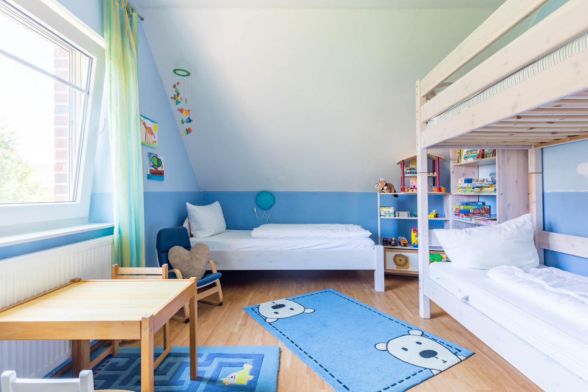 Ein Highlight des Ferienhauses ist für Kinder definitiv das liebevoll eingerichtete Gäste-/ Kinderzimmer: es beinhaltet ein Etagenbett und ein Einzelbett. Langeweile kommt hier nicht auf, denn der Raum bietet mit einer eigenen Spielecke den Kleinen genügend Platz zum Spielen. In allen drei Schlafräumen befindet sich außerdem ein Kleiderschrank für Ihre Garderobe.