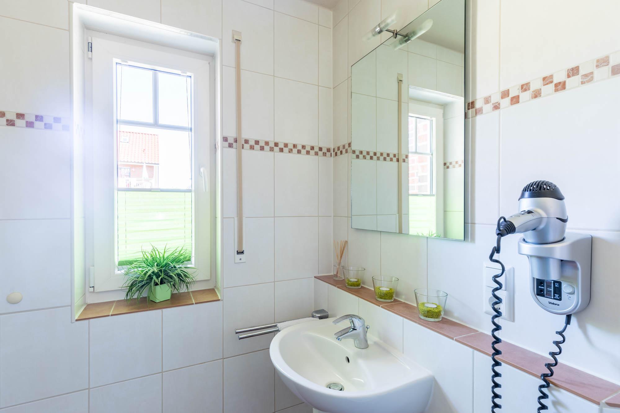 Das Badezimmer, ebenfalls mit Fenster, im Obergeschoss hat neben einer Dusche und WC auch eine Badewanne.