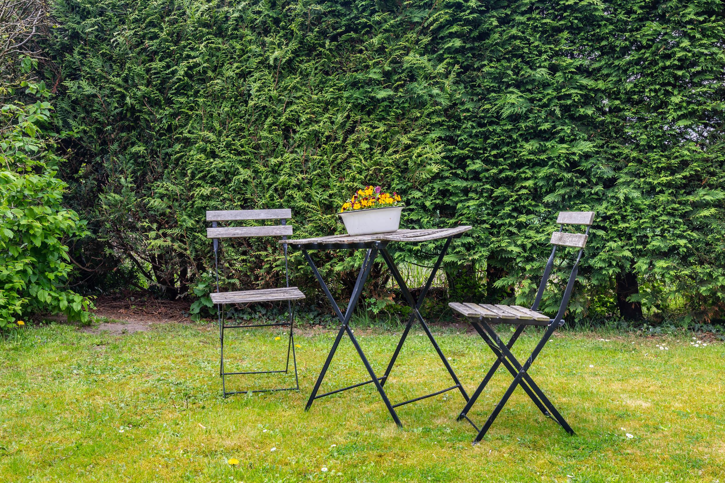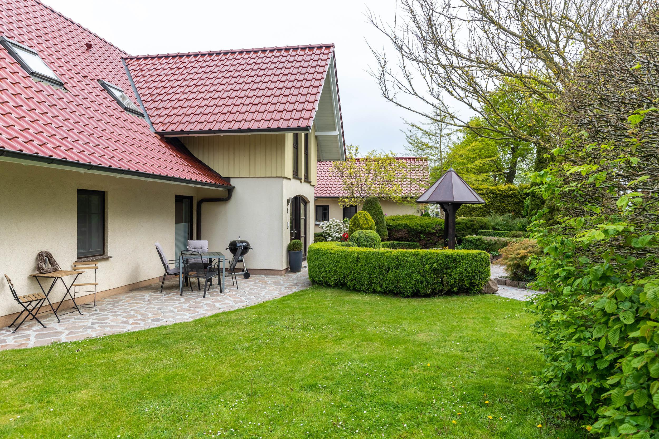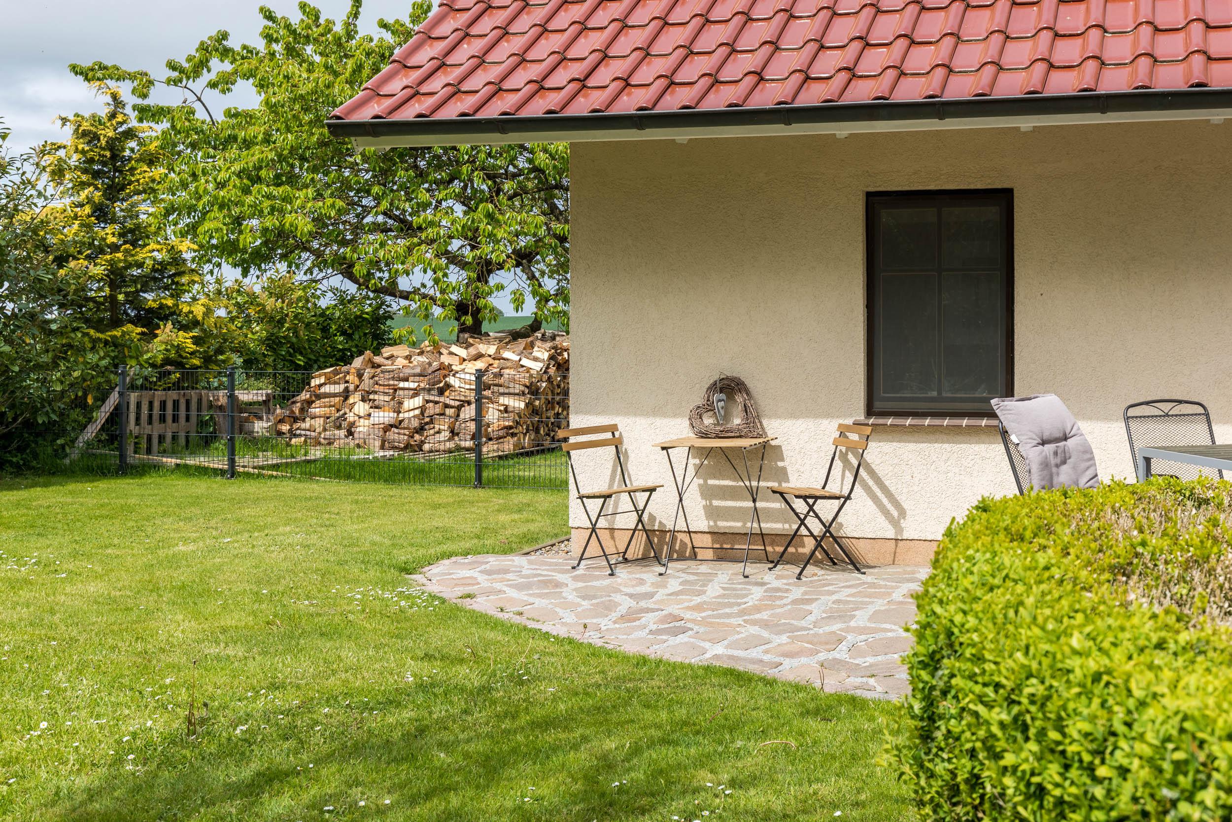 Vom Essbereich aus können Sie auf die möblierte Südost-Terrasse gelangen. Das schöne begrünte Grundstück des Hauses ist eingezäunt, z.T. durch Hecke, z.T. durch Zaun. Hier können Sie entspannt Ihren Urlaub genießen, das Grundstück grenzt an ein Feld.