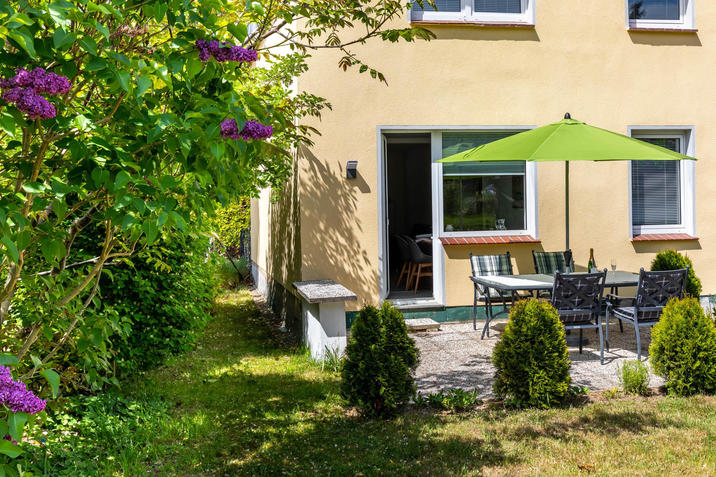 Auf der Südost-Terrasse finden Sie moderne Aluminium-Gartenmöbel vor und genießen den schönen Blick auf den eingezäunten ( Zaun/ Hecke) Garten.