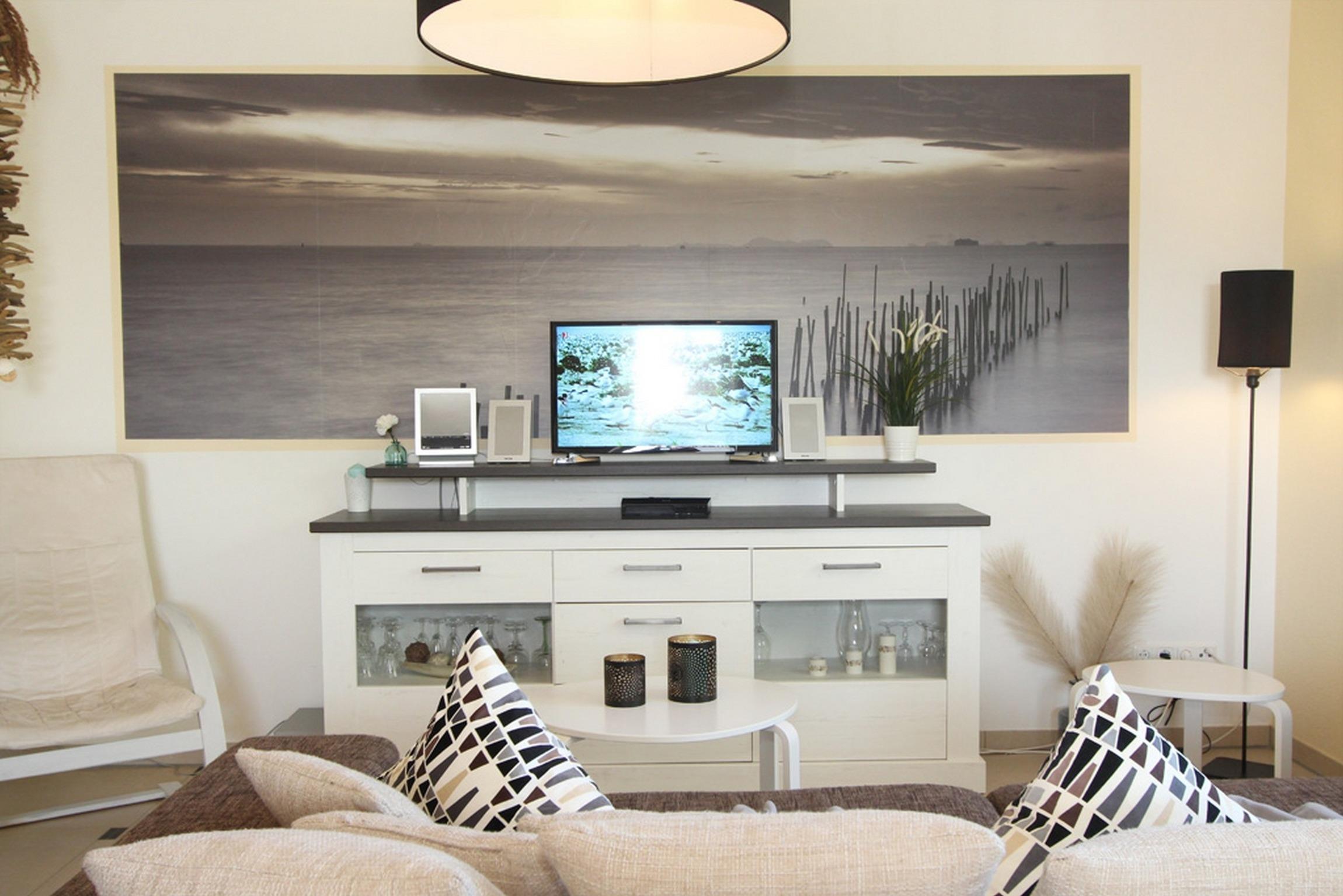 Sie verfügt über einen hellen Wohnbereich mit großem Wohlfühlsofa (Schlafmöglichkeit für die 3. Person) in schönem Design, SAT-TV (Flatscreen)/ DVD-Player und Radio mit CD-Player.
