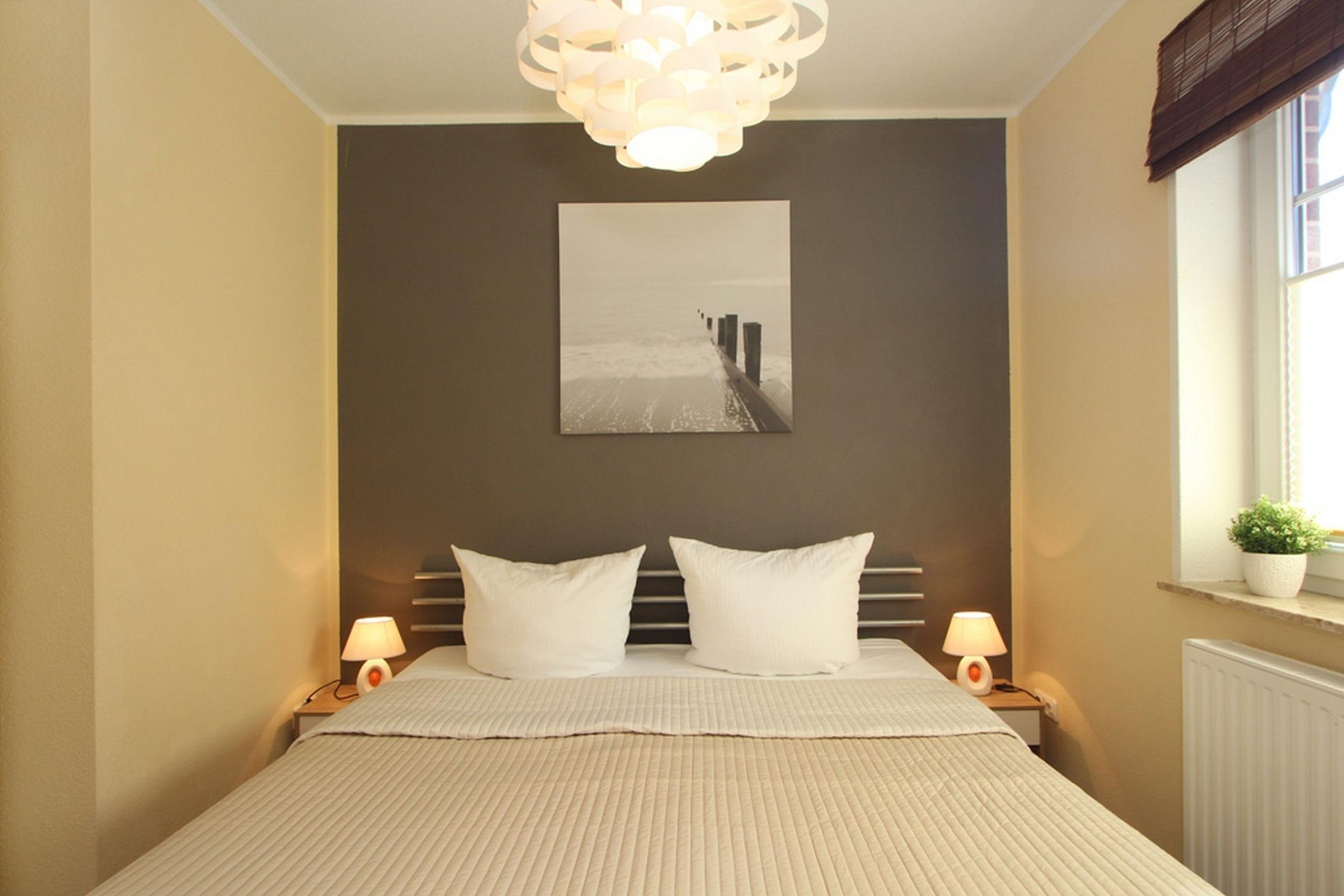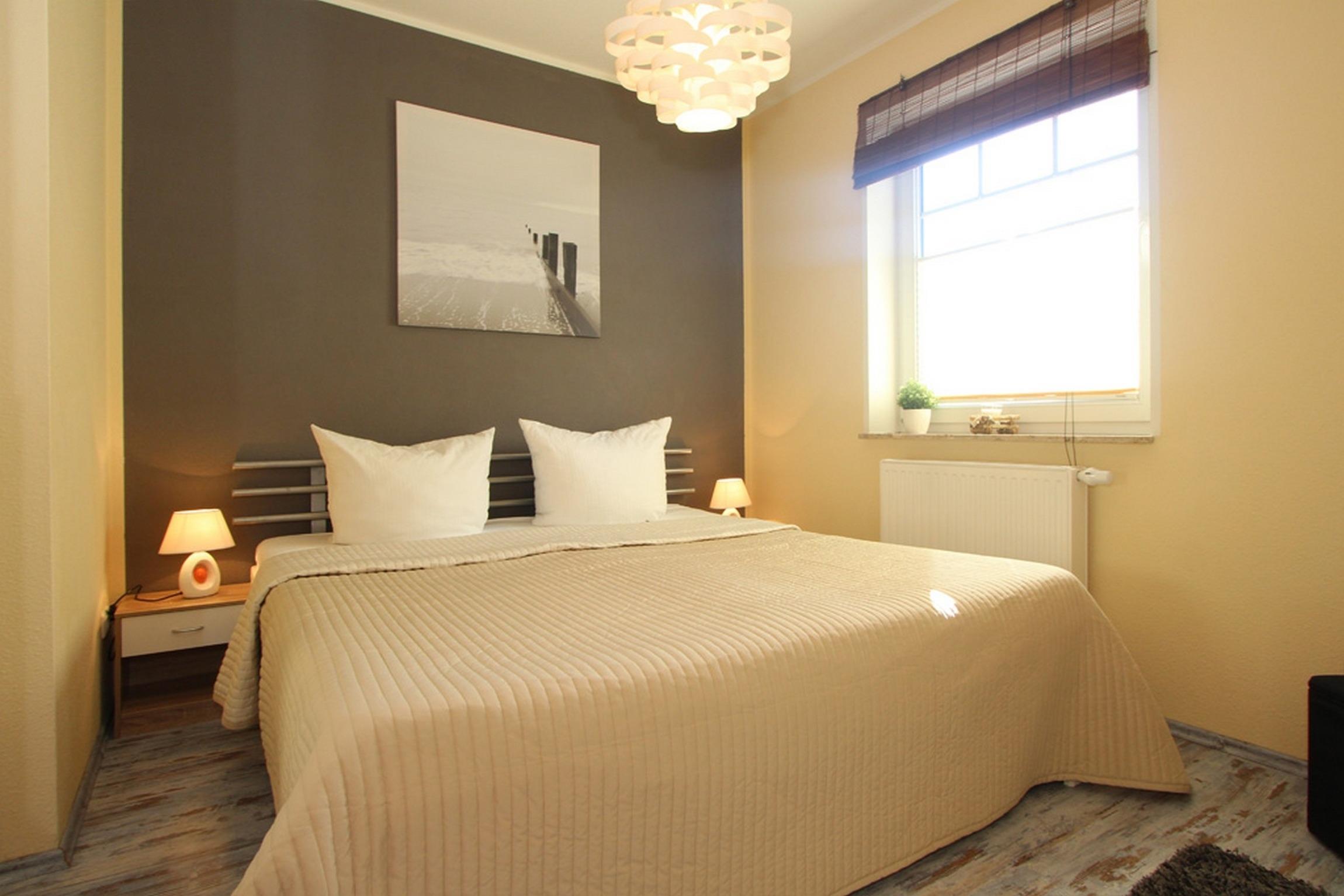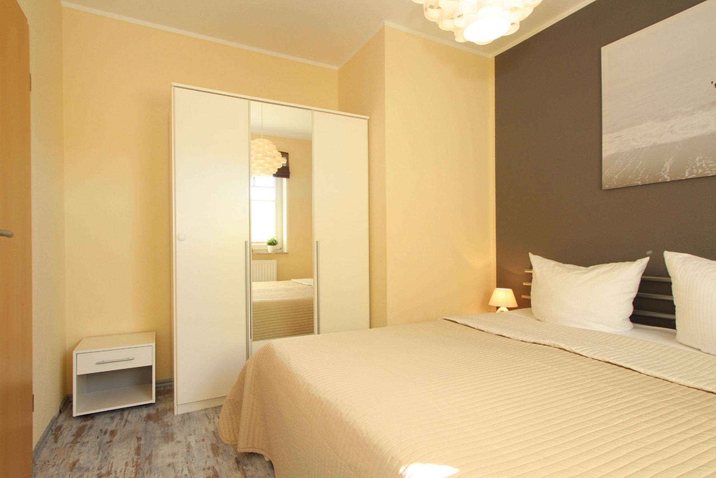 Das Schlafzimmer ist mit einem bequemen Doppelbett und geräumigem Kleiderschrank für Ihre Urlaubsgarderobe ausgestattet.