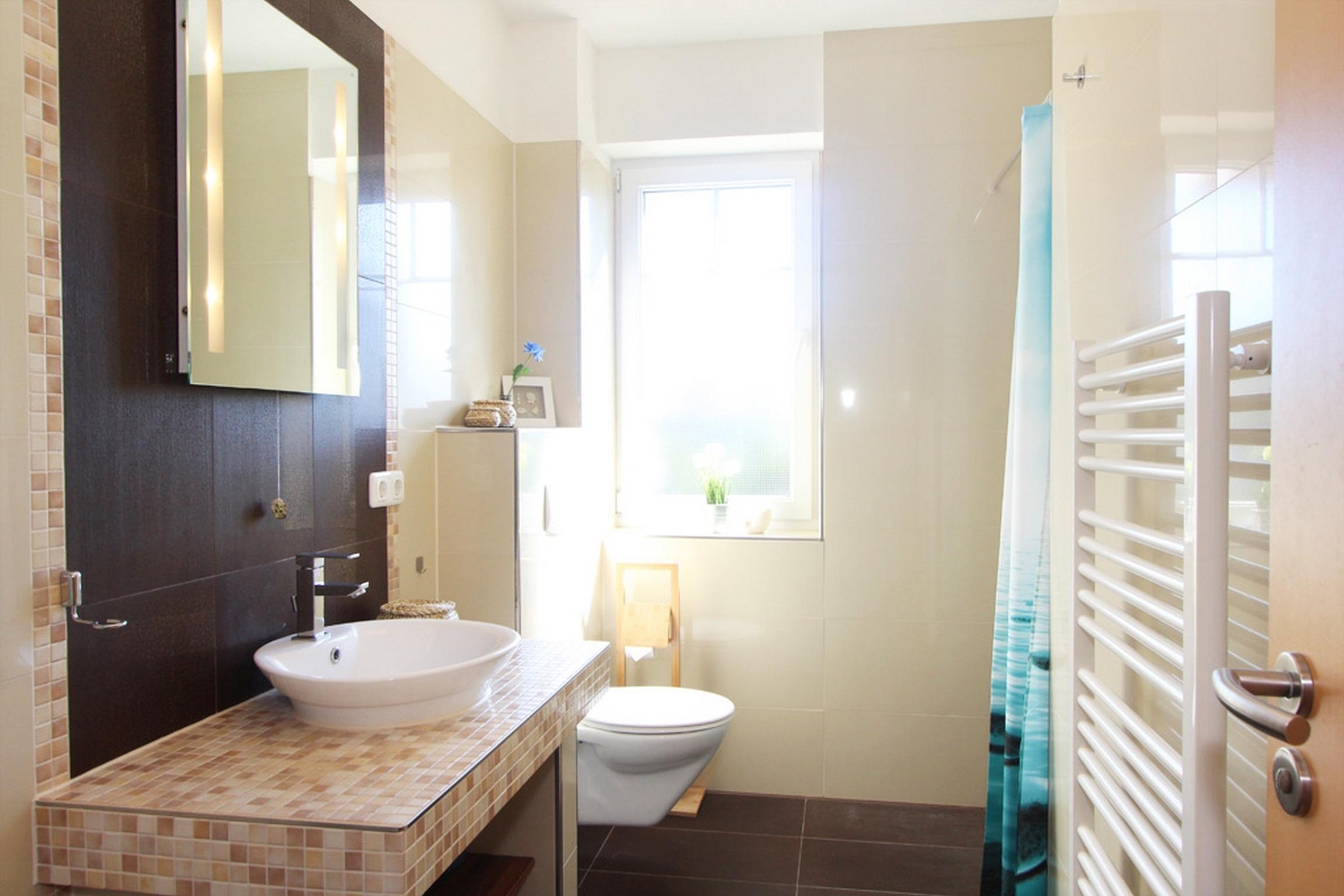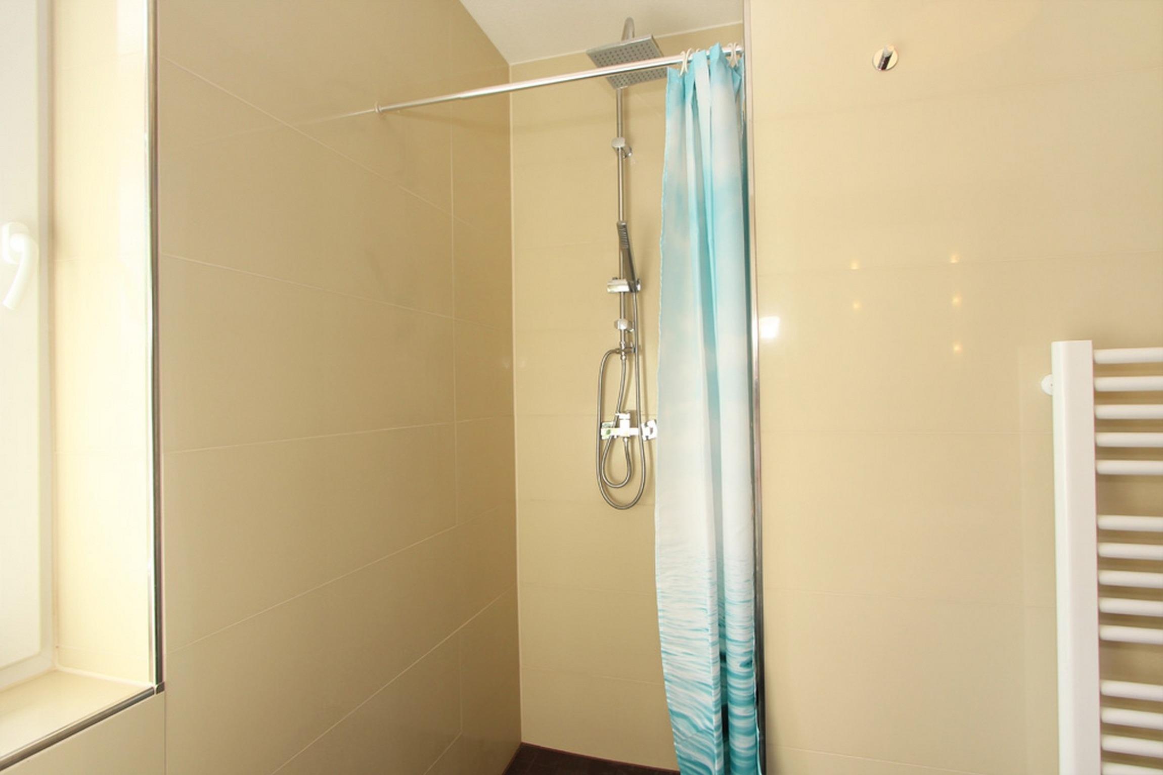 Das geflieste Bad bietet eine bodengleiche Dusche, WC, Fußbodenheizung und einen Handtuchtrockner.