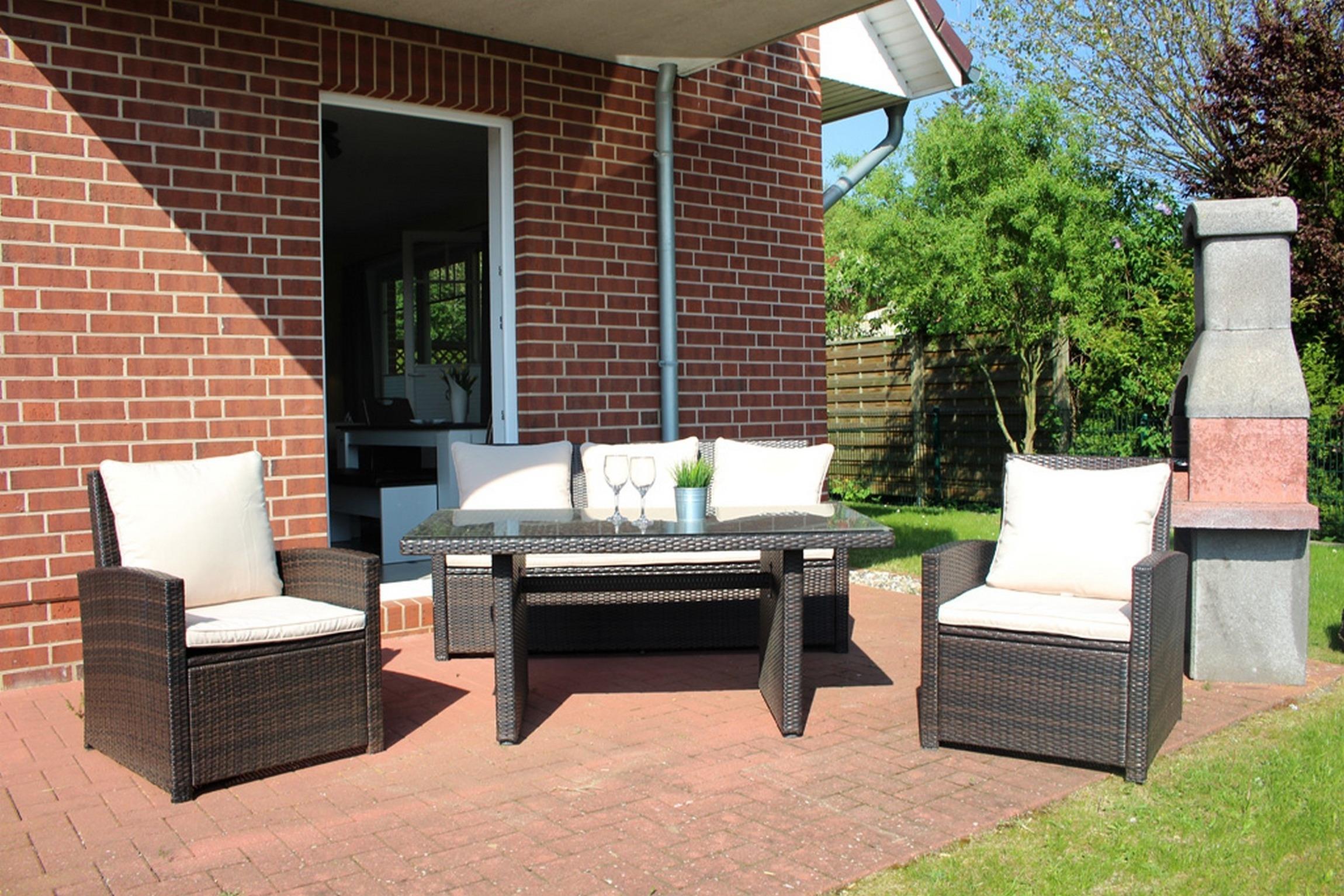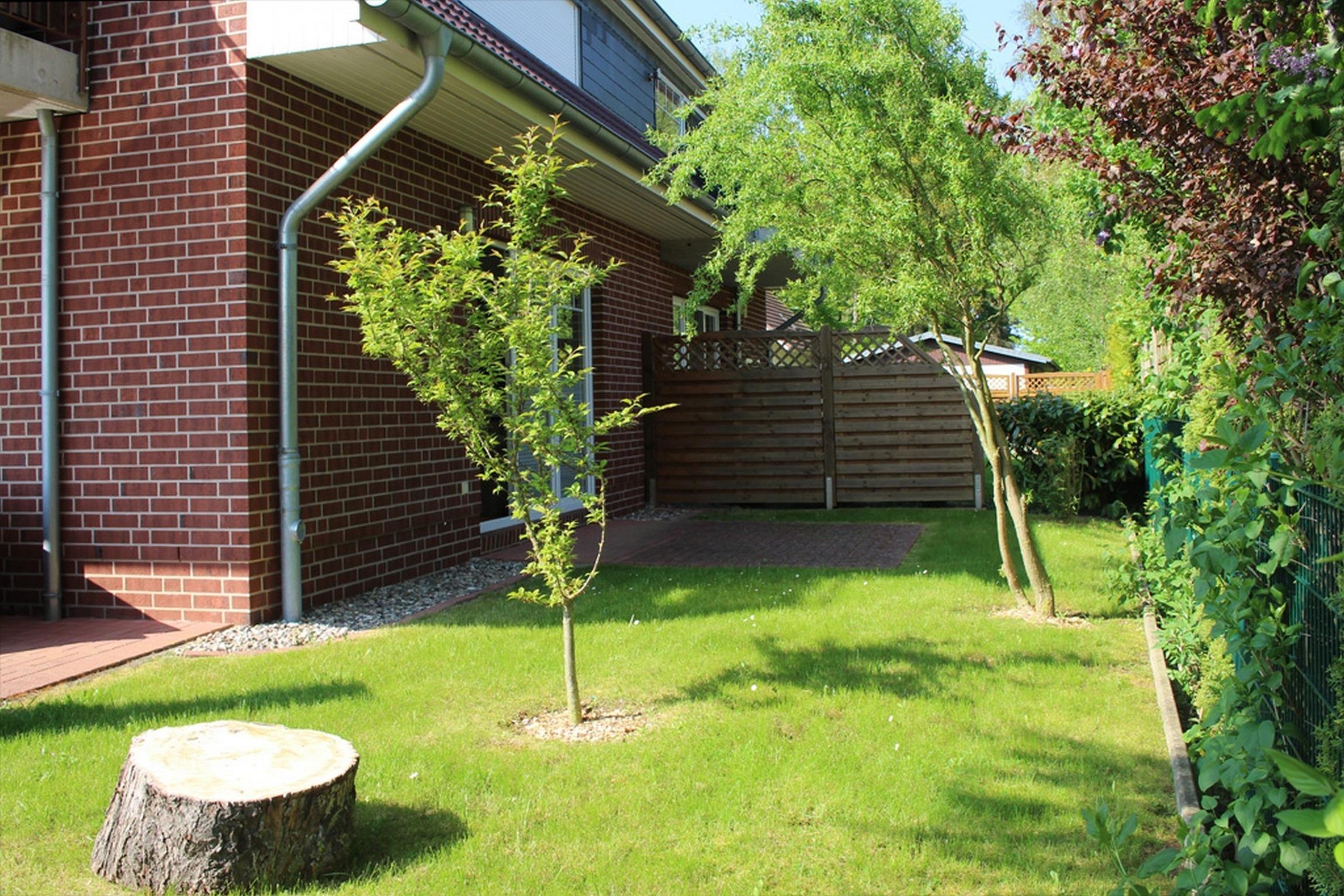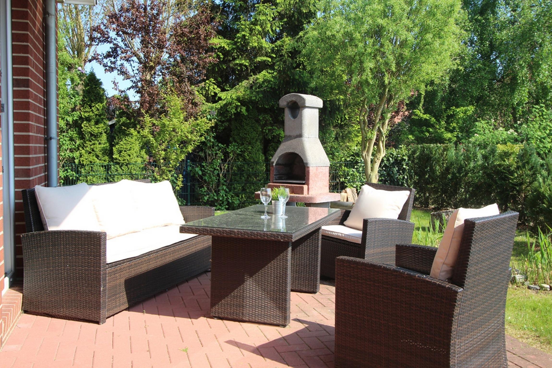 Die möblierte Süd-Terrasse lädt zu einem gemütlichen Grillabend ein. Das begrünte Grundstück ist zum Teil von Hecke umgeben und somit etwas sichtgeschützt.