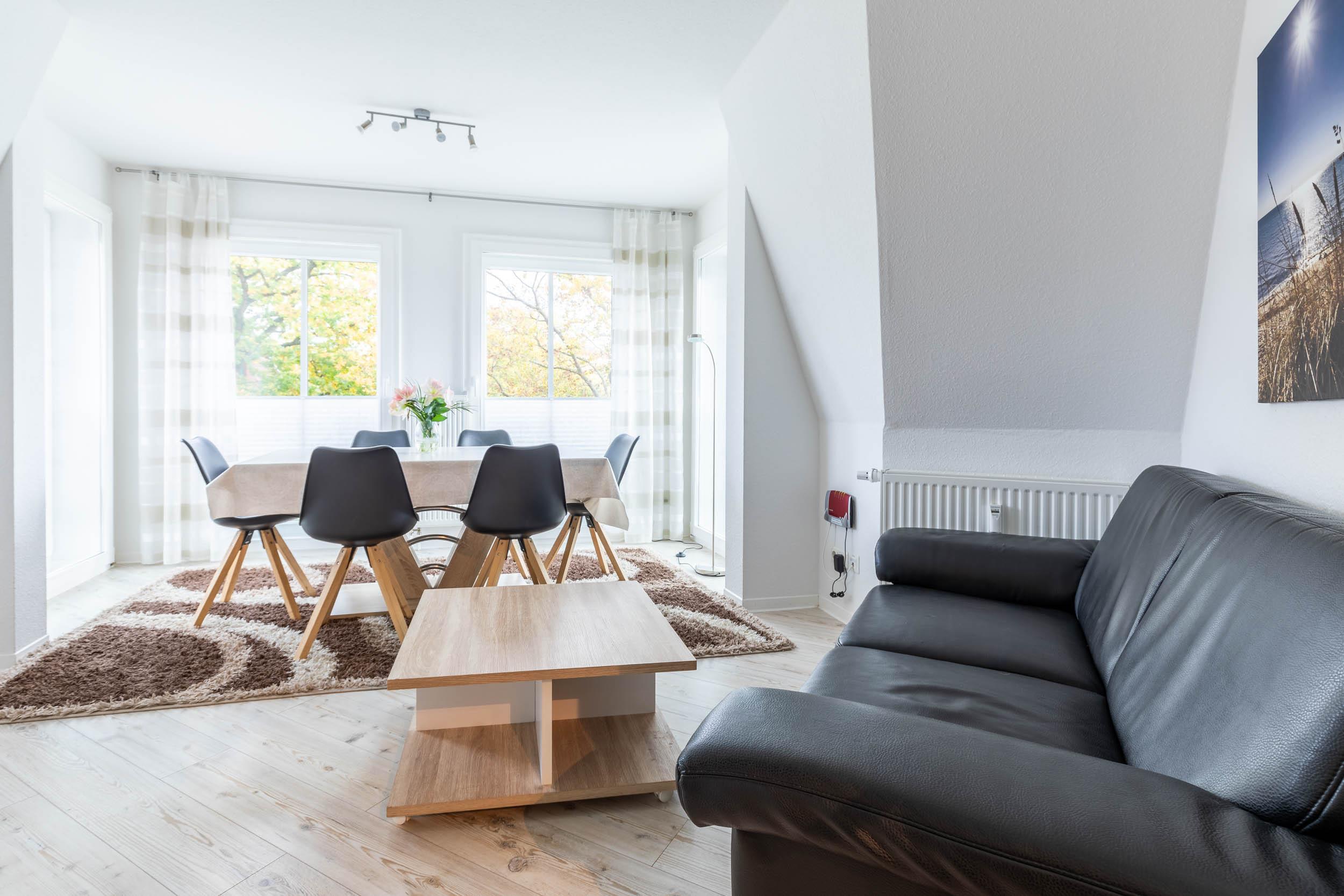 In dieser großzügigen 3-Zimmer-Ferienwohnung im 2.OG wurde auf den gesamten 94qm Wohnfläche sehr großen Wert auf individuelle Nutzungsmöglichkeiten gelegt. Ob für einen Familienurlaub mit bis zu 5 Gästen + Kleinkind oder auch für einen gemeinsamen Urlaub mit einem befreundeten Paar ist diese Wohnung optimal ausgestattet, da das zweite Schlafzimmer die Möglichkeit bietet, die beiden Einzelbetten direkt aneinander zu schieben, um somit ein zweites Doppelbett zu erhalten.