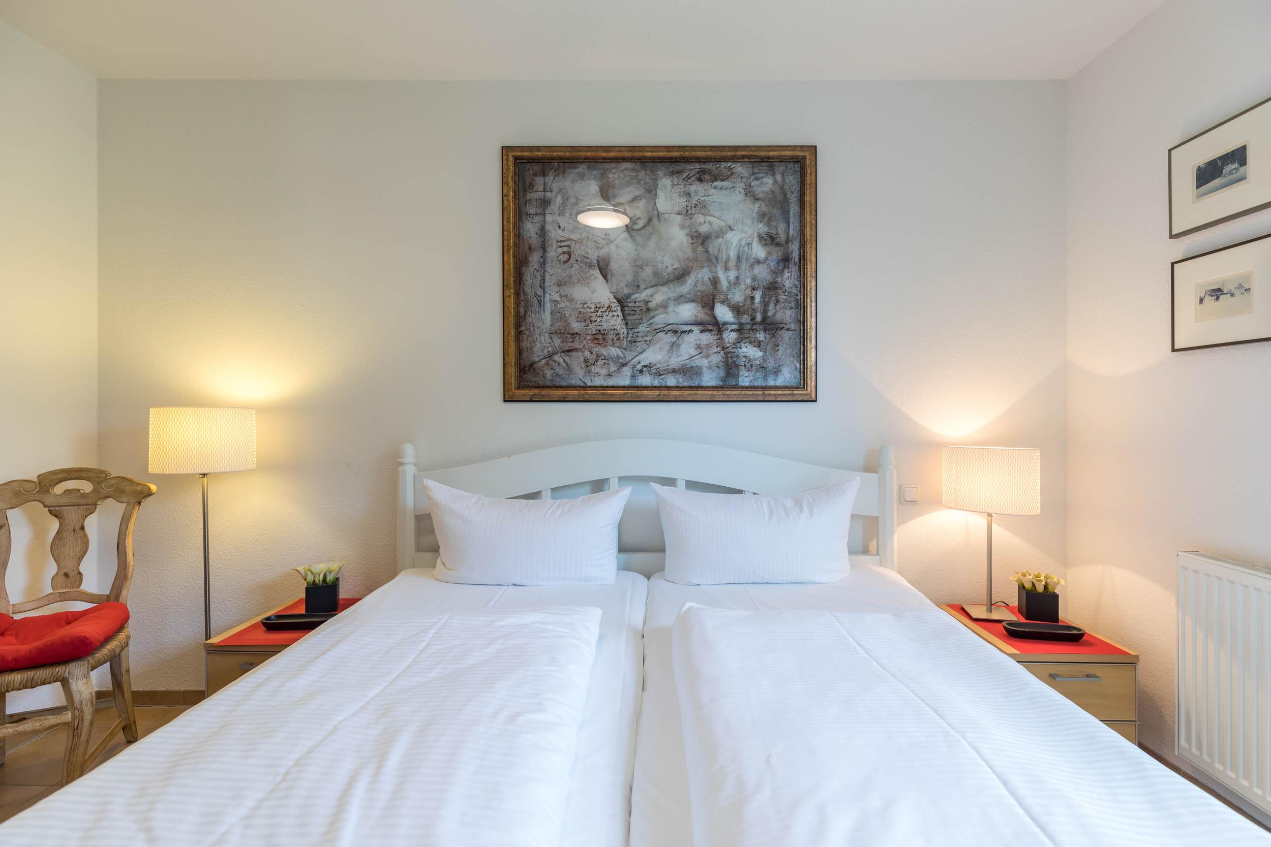 Ein Schlafzimmer bietet ein Doppelbett (200x200cm) einen großzügigen Kleiderschrank. Im Gästezimmer finden Sie ebenfalls ein Doppelbett (160x200cm), eine Kommode sowie einen zweiten SAT-TV.
