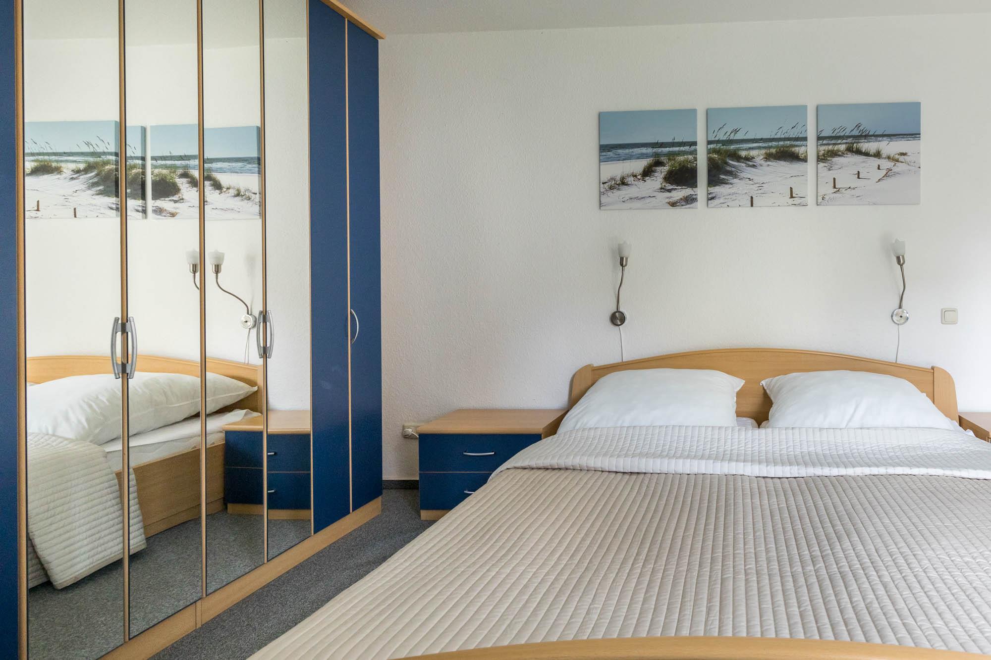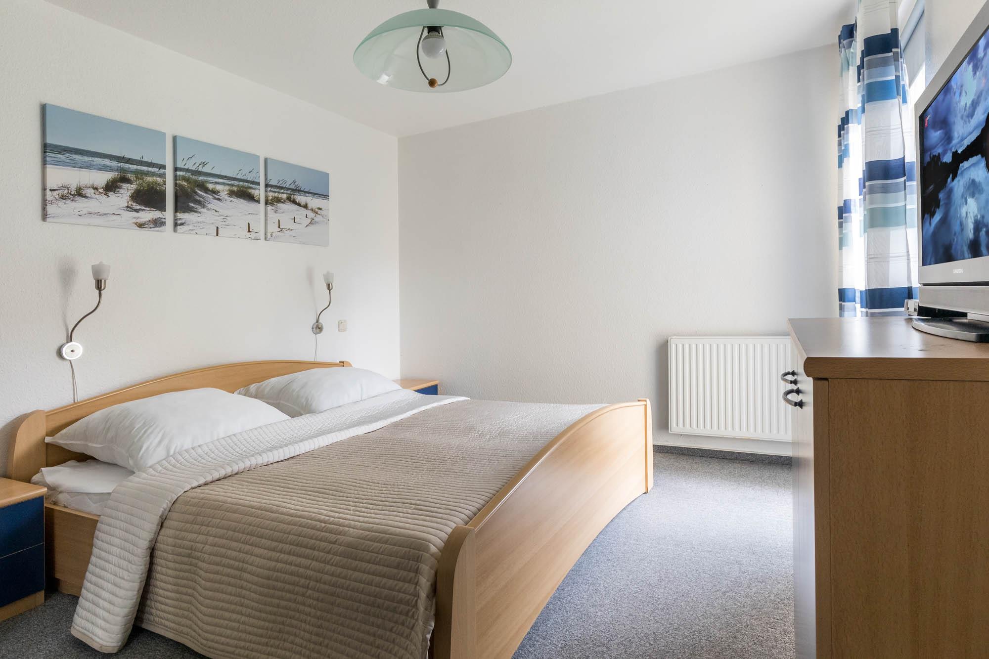 Das Schlafzimmer verfügt über ein bequemes Doppelbett (180x200cm) und einen großen Kleiderschrank für Ihre Garderobe. Außerdem steht Ihnen hier noch ein zusätzlicher Flatscreen-TV zur Verfügung.