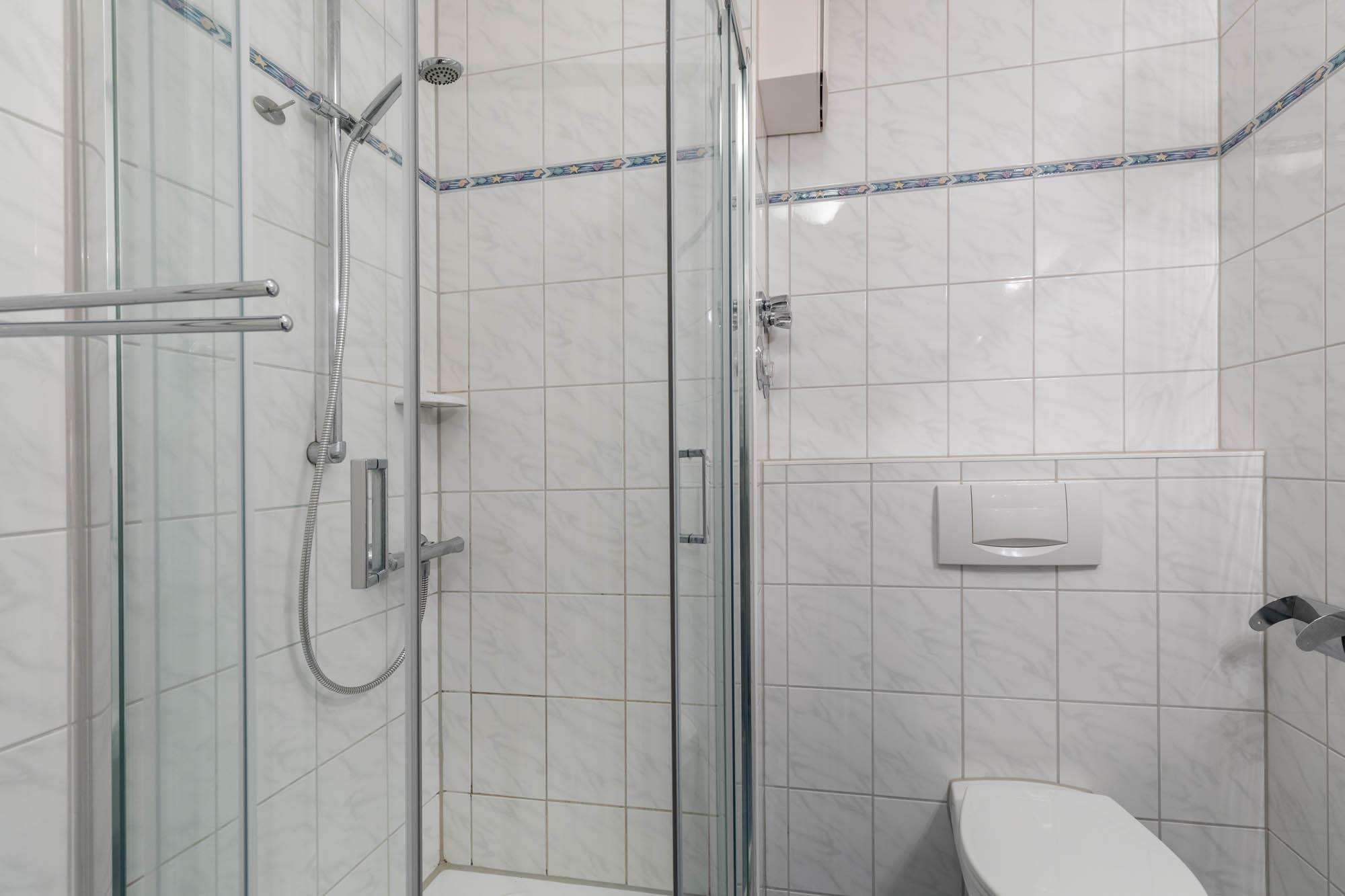 Ein Badezimmer mit Dusche und WC komplettiert die Wohnung.
