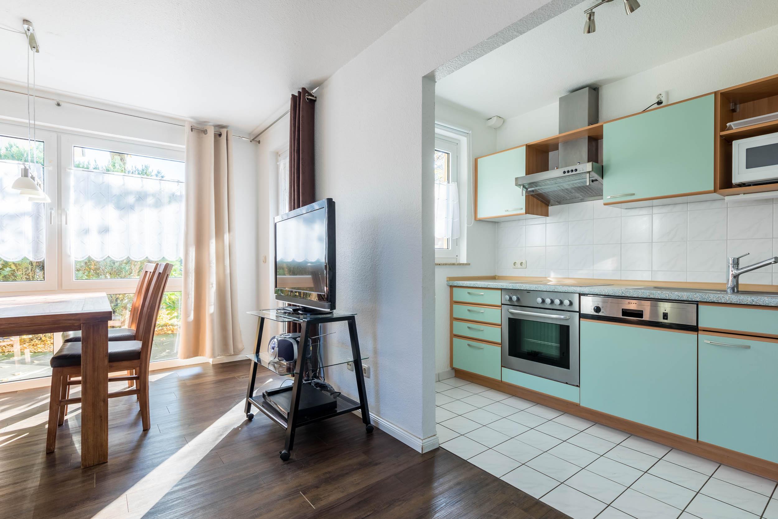 Auch die Küche lässt keine Wünsche offen. Der Feriengast findet hier von Herd mit Backofen über Mikrowelle bis Spülmaschine alles vor, was eine zeitgemäß komfortable Küche ausmacht. Der Kühlschrank ist mit einem Gefrierfach ausgestattet.