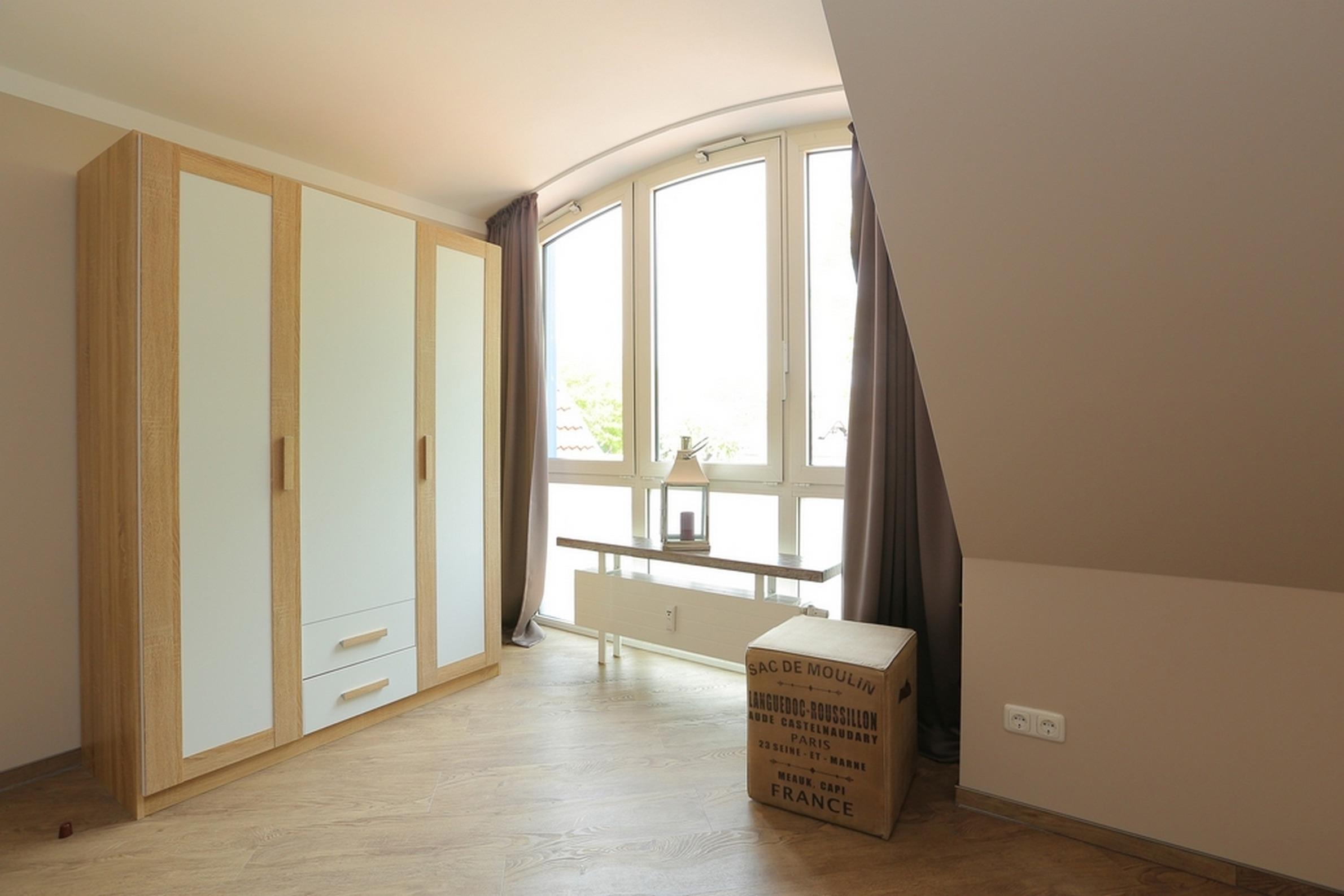 Das separate Schlafzimmer ist mit einem bequemen Doppelbett und einem geräumigen Kleiderschrank eingerichtet.