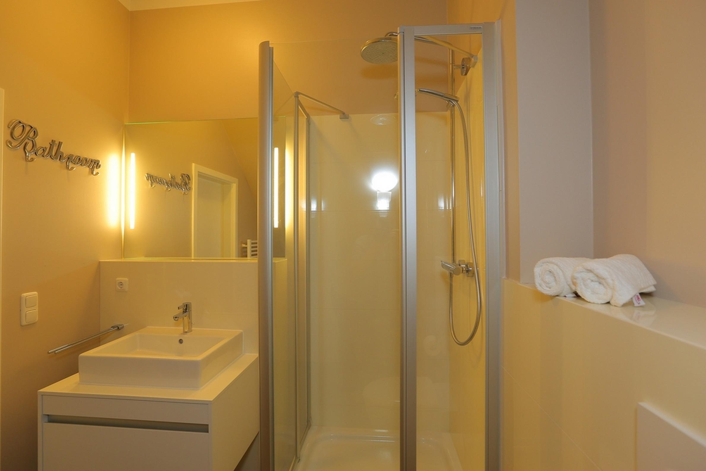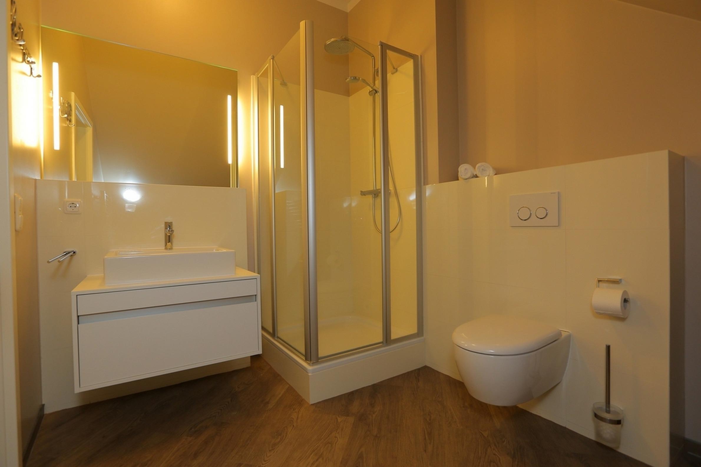 Ein modernes Duschbad mit WC komplettiert die geschmackvolle Nichtraucherwohnung.