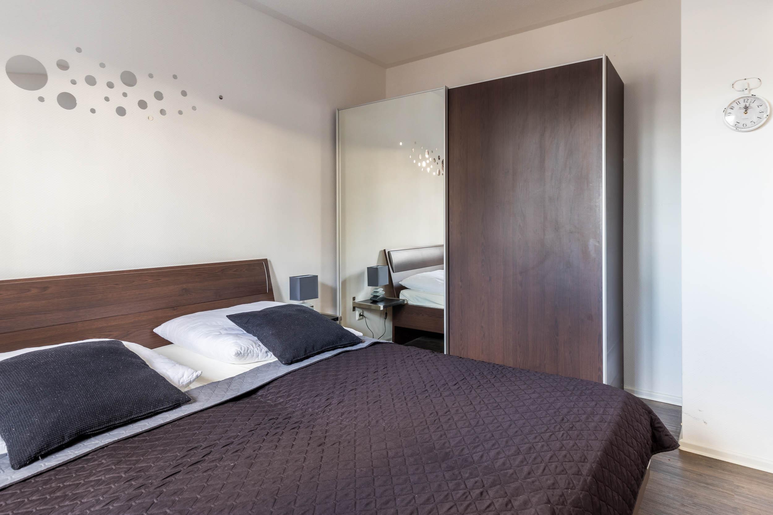 Im Schlafzimmer finden Sie ein bequemes Doppelbett (180x200cm) und einen großzügigen Kleiderschrank für Ihre Urlaubsgarderobe.