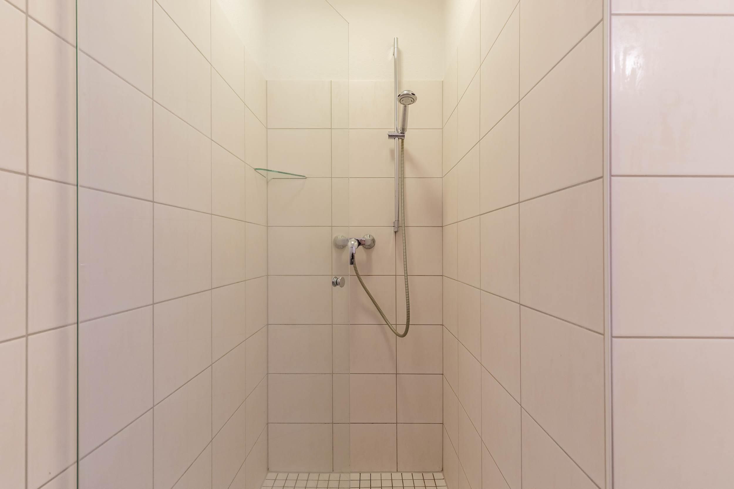 Das hell geflieste Bad ist mit einer ebenerdigen Dusche sowie WC eingerichtet, auch ein Föhn gehört zur Ausstattung.