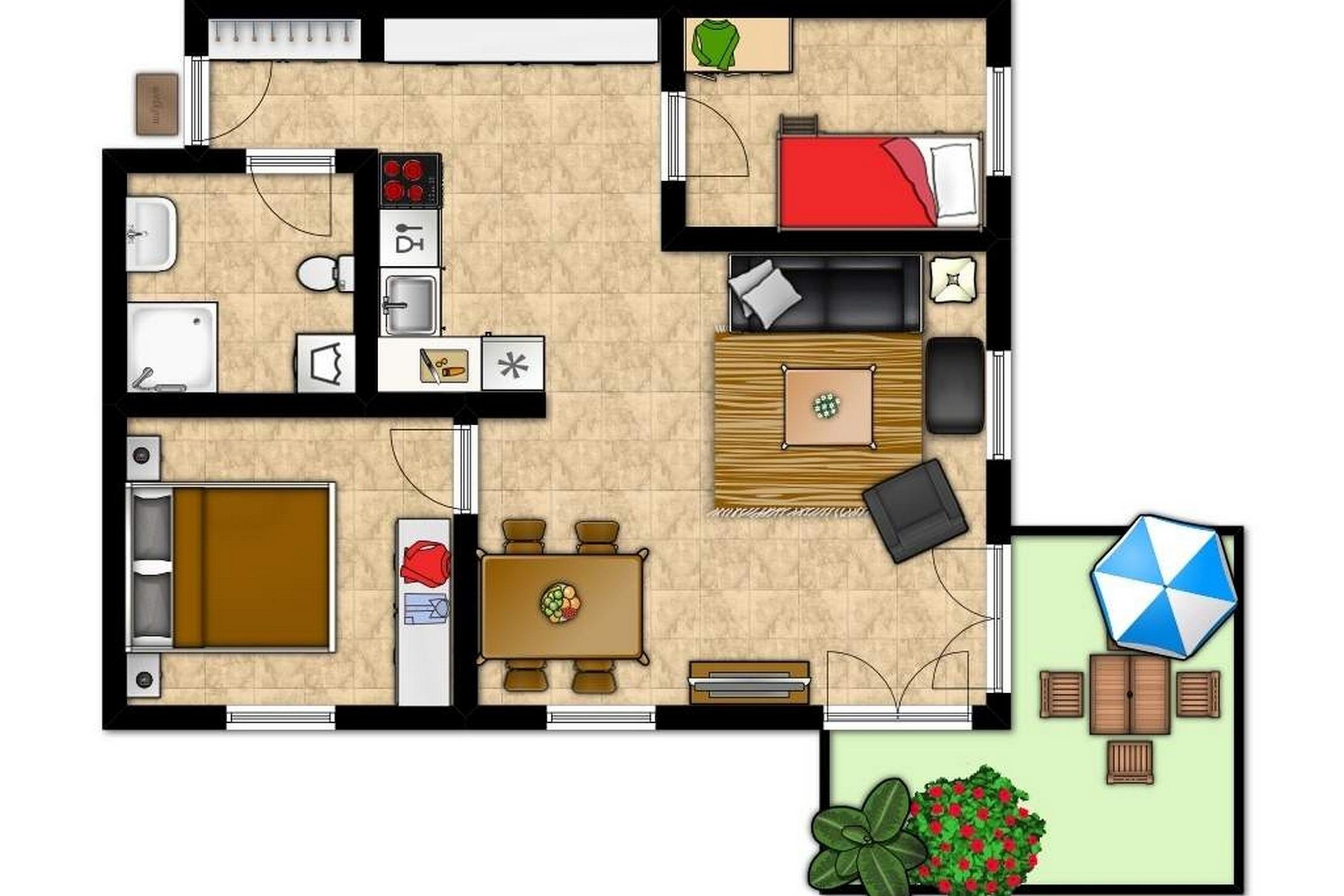 In dieser Wohnung gibt es zwei Schlafzimmer: Das erste Schlafzimmer (180x200cm) verfügt über ein Doppelbett und über einen Kleiderschrank. Das Gäste-/ Kinderzimmer ist mit zwei Einzelbetten (je 90x200cm) möbliert.