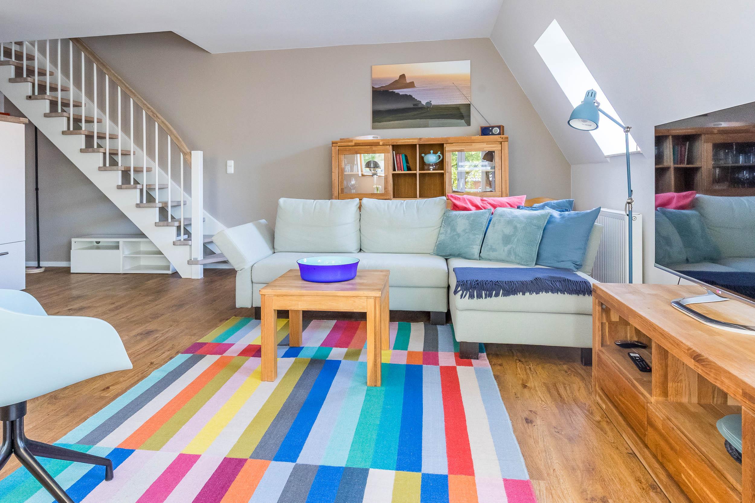 Im Wohn- und Esszimmer im unteren Bereich der Wohnung steht zentral das gemütliche Sofa mit Flatscreen-TV mit Waipu-TV (zum Streamen bspw. von Netflix und Amazon Video [eigener Account erforderlich]) DVD-Player, Radio und Musikanlage. Das Sofa lädt im Sommer und im Winter zum Lesen und Entspannen ein.