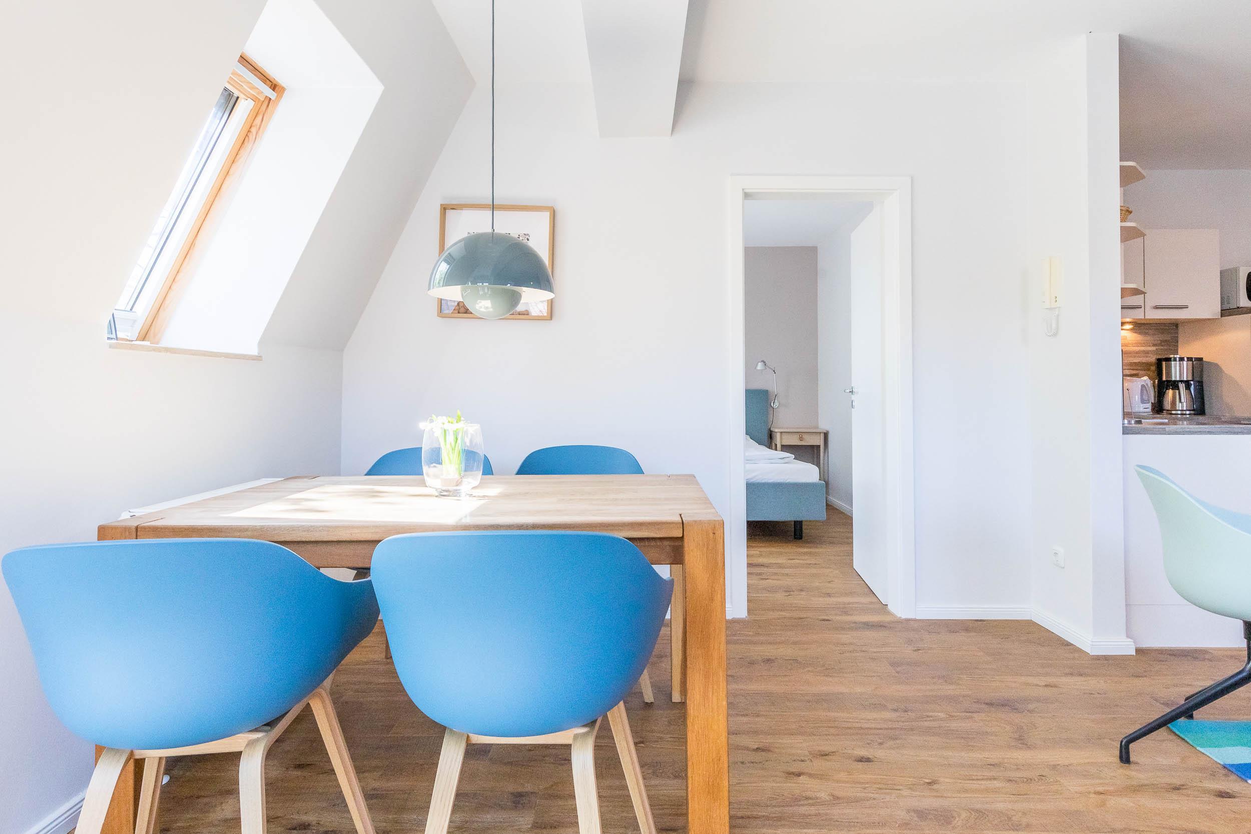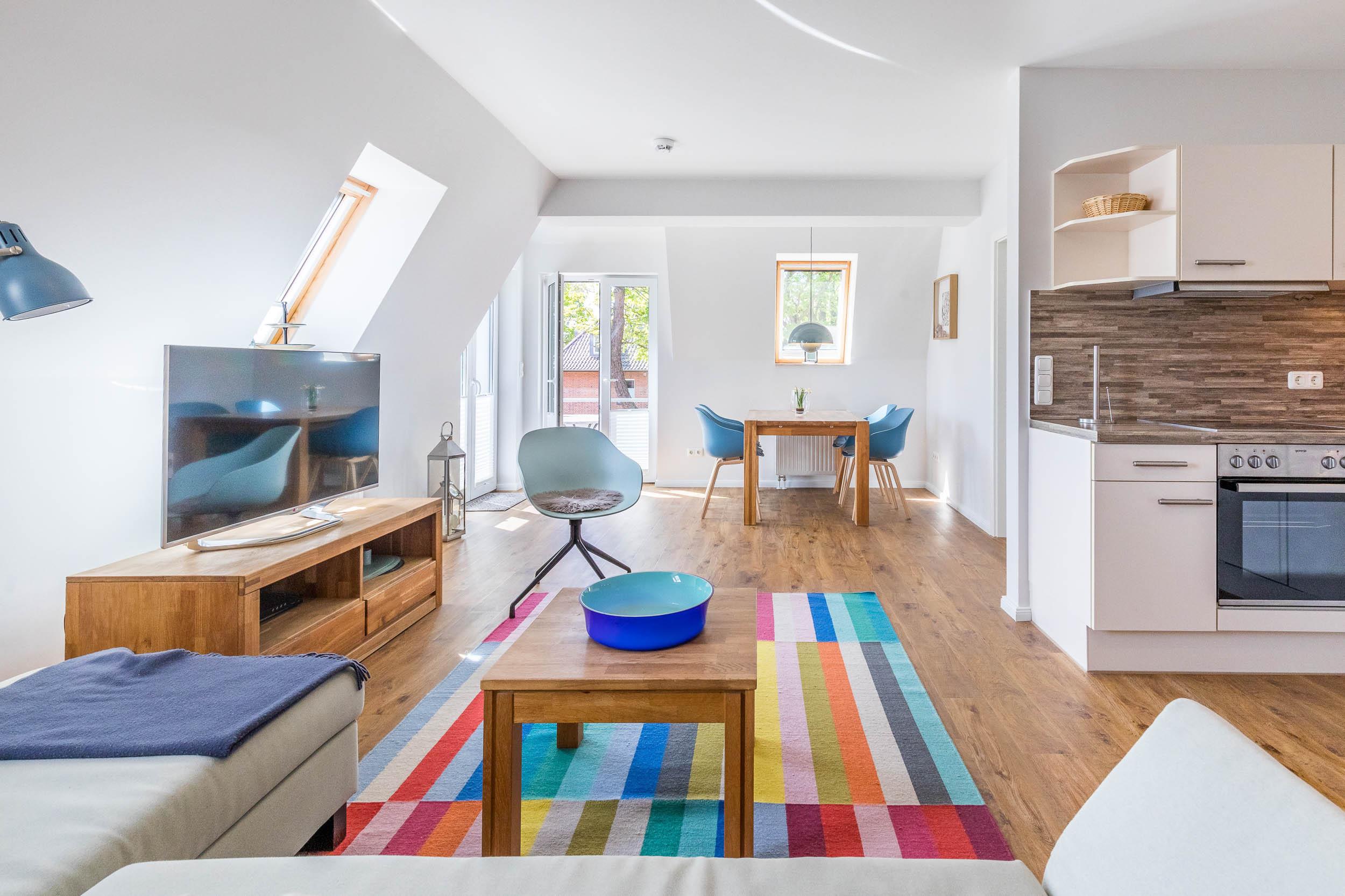 Die moderne 3-Zimmer-Wohnung im 2.OG, die sich mit 70qm Wohnfläche über zwei Ebenen erstreckt, ist lichtdurchflutet und komfortabel für max. 4 Gäste + Kleinkind ausgestattet.