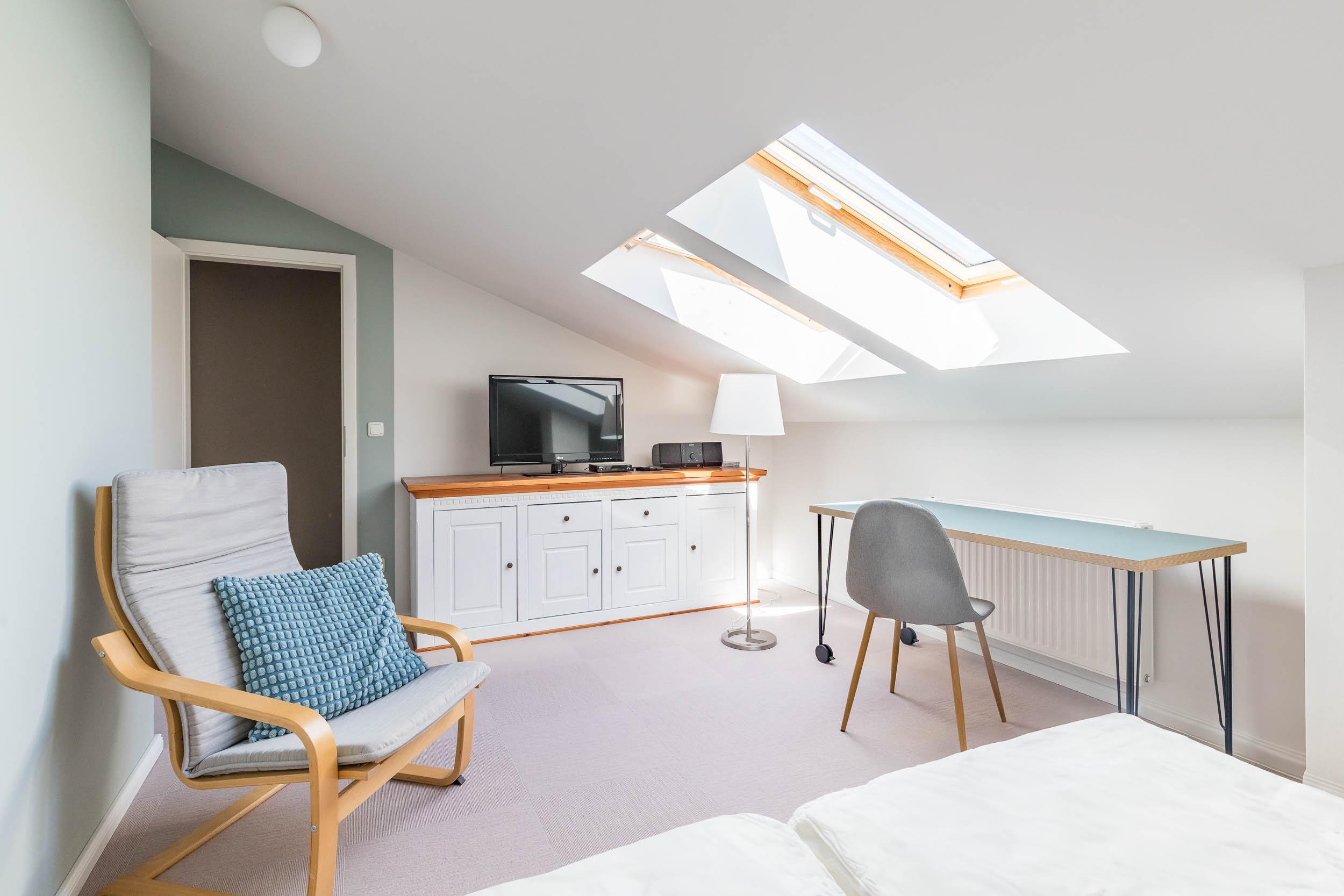 Oben befindet sich das zweite Schlafzimmer mit zwei Einzelbetten (je 90x200cm), die auch zusammengestellt werden können. Ein zweiter TV-Flatscreen, ein Lesesessel und eine großen Kommode sowie ein Schreibtisch (Arbeitsplatz) runden das Wohnangebot ab. Ein Reisebettchen kann hier bei Bedarf zusätzlich aufgestellt werden.