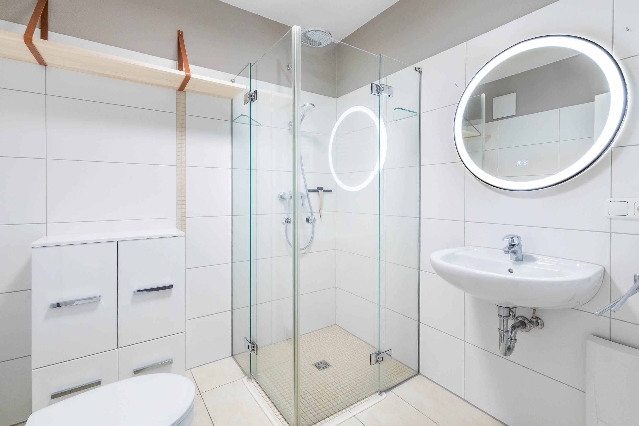 Das Bad ist mit einer ebenerdigen Regenschauer-Dusche, einem WC und einem praktischen Handtuchtrockner und LED-Spiegel eingerichtet.