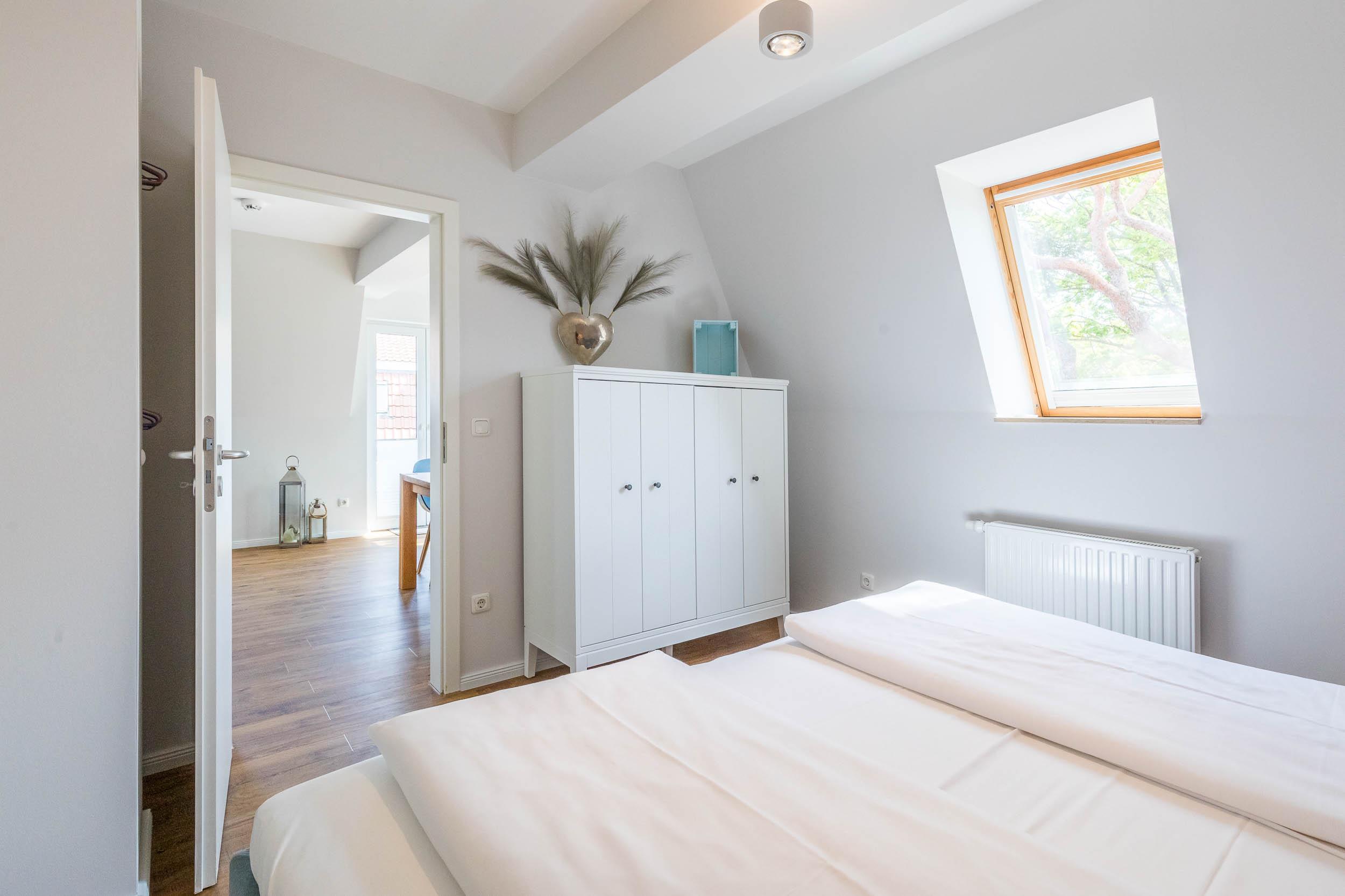Die Wohnung bietet hochwertige Betten und einen Schreibtisch (beispielsweise für Workation). Zahlreiche Designklassiker verleihen der Wohnung ein klares und ansprechendes Ambiente.