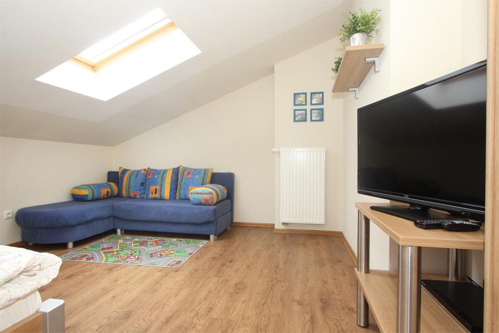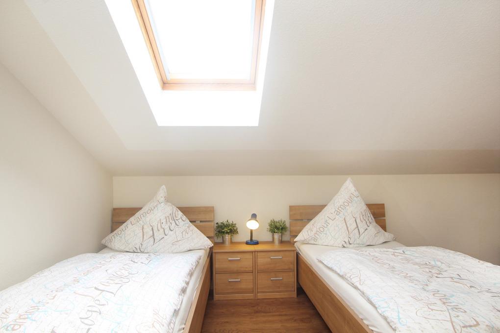 Das zweite Schlafzimmer/ Kinderzimmer in der 2. Ebene, im DG ist mit zwei Einzelbetten und zusätzlicher Schlafcouch sowie ebenfalls einem eigenen Flatscreen-TV ausgestattet.