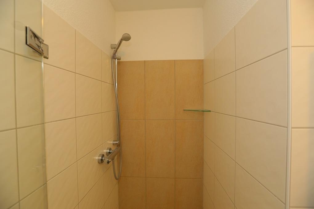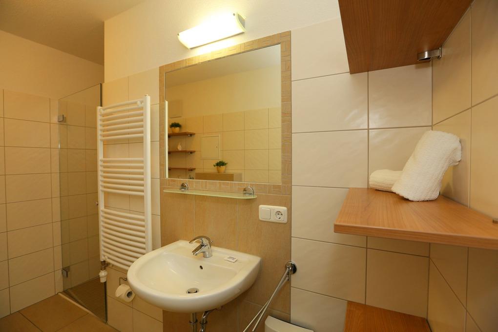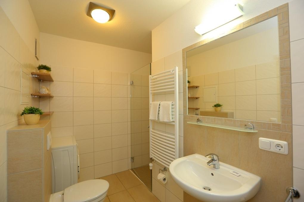 Im praktischen Bad mit ebenerdiger Dusche befinden sich auch eine Waschmaschine und ein Handtuchtrockner.