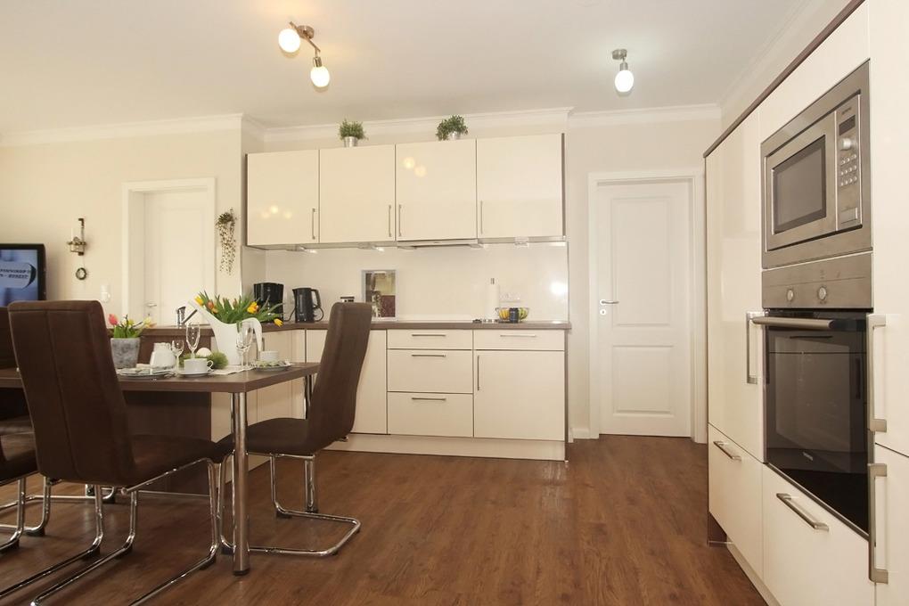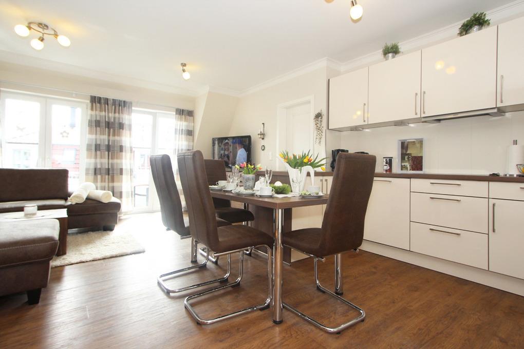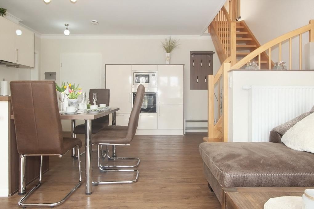 In einem rundum geschmackvollen Ambiente genießen die Gäste zeitgemäßen Komfort. Der offene Wohn- und Essbereich in der 1. Wohnebene enthält u.a. eine hervorragend bestückte Küchenzeile sowie eine strapazierfähige Polsterlandschaft, die zu gemütlichen Gesprächsrunden und entspannenden Lesestunden einlädt. Für Unterhaltung sorgen hier ein großer moderner Flatscreen SAT-TV und ein DVD-Player.