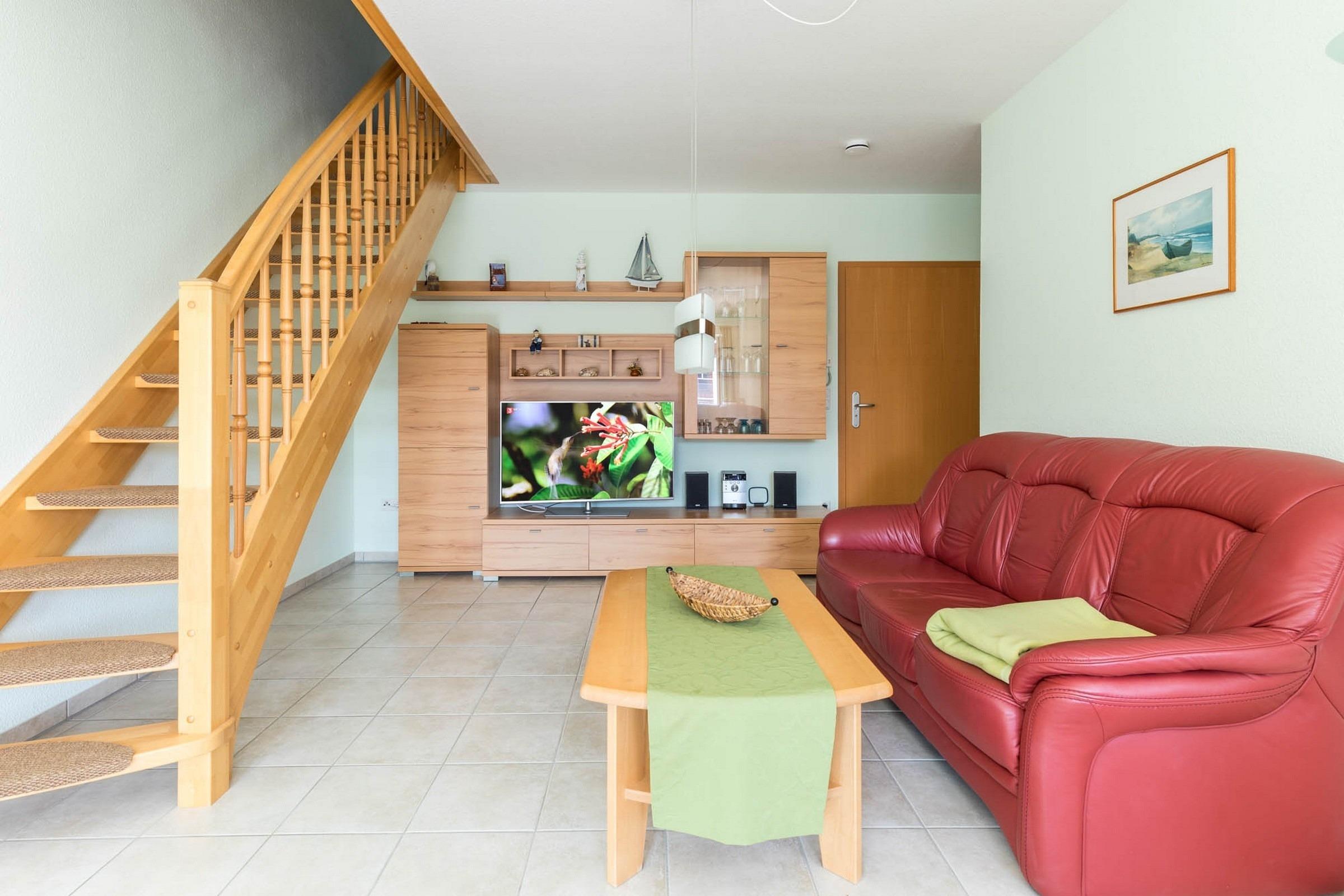 Sie verfügt in der ersten Wohnebene über einen offenen Wohn- und Essbereich mit Essecke und Sofa, Sat-TV und Radio.