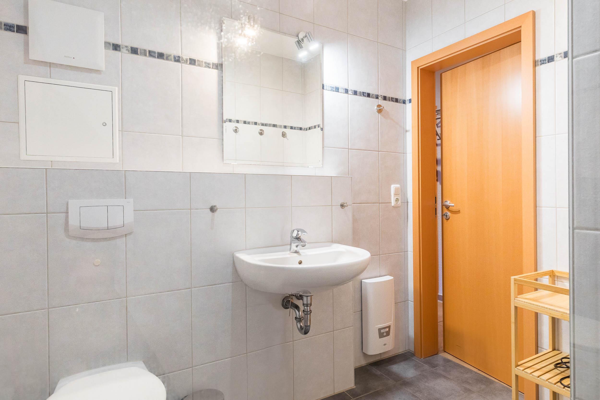 Das Badezimmer auf selbiger Ebene beinhaltet ein modernes Duschbad, ein WC und einen Handtuchtrockner.