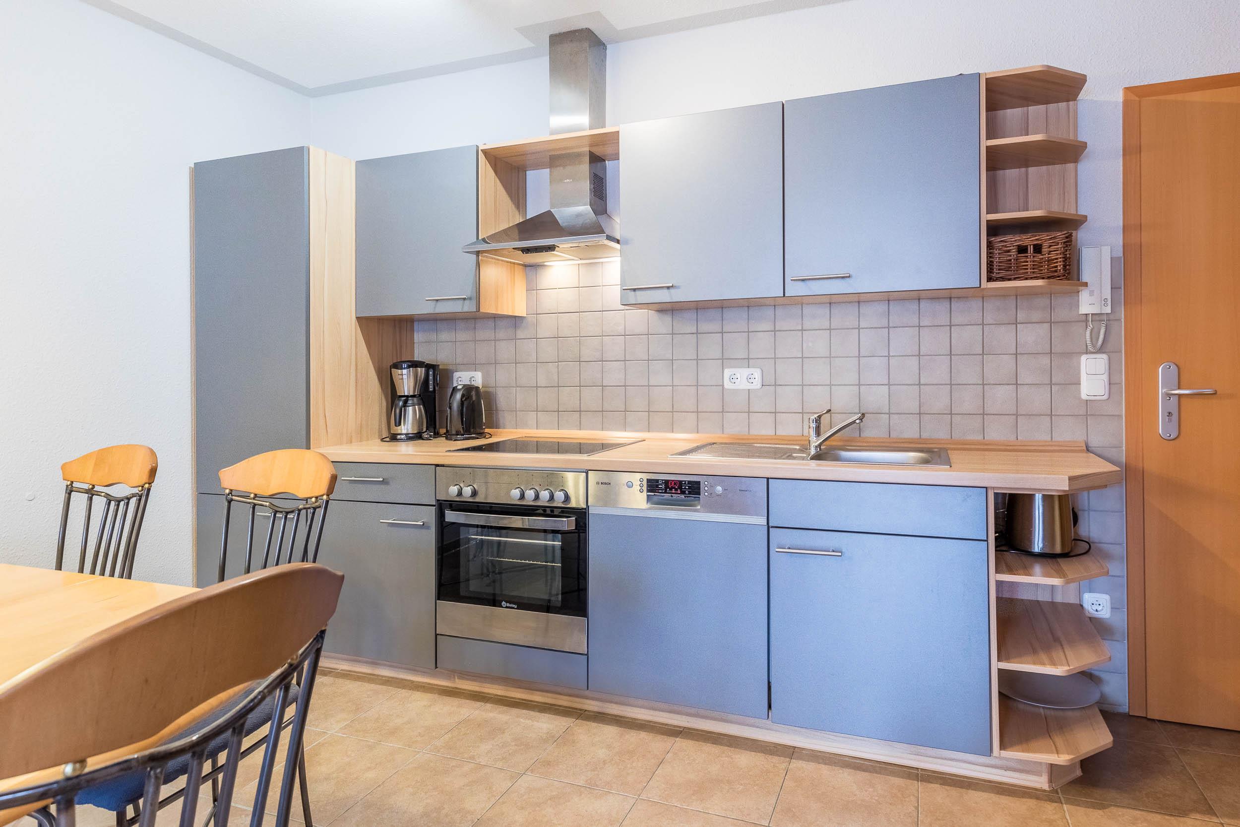 Die hier integrierte Küchenzeile bietet optimale technische Einrichtungen – wie eine Spülmaschine, einen Kühlschrank mit Gefrierfach, eine Kaffeemaschine, einen Herd bzw. Backofen und einen Toaster.