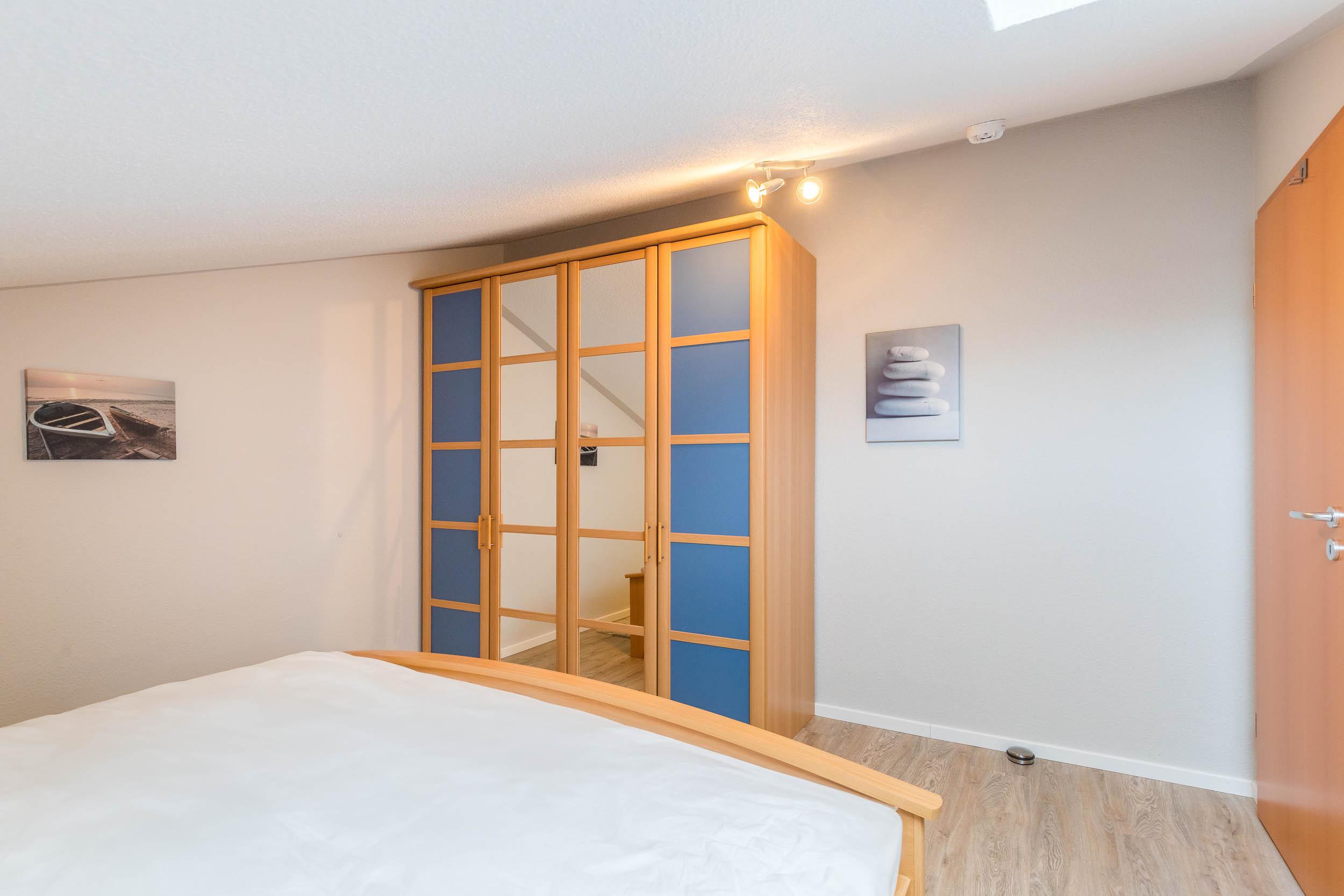 Das zweite Schlafzimmer, mit Doppelbett, ist in der zweiten Wohnebene, im DG eingerichtet. Auch hier gibt es einen großzügigen Kleiderschrank für Ihre Urlaubsgarderobe.