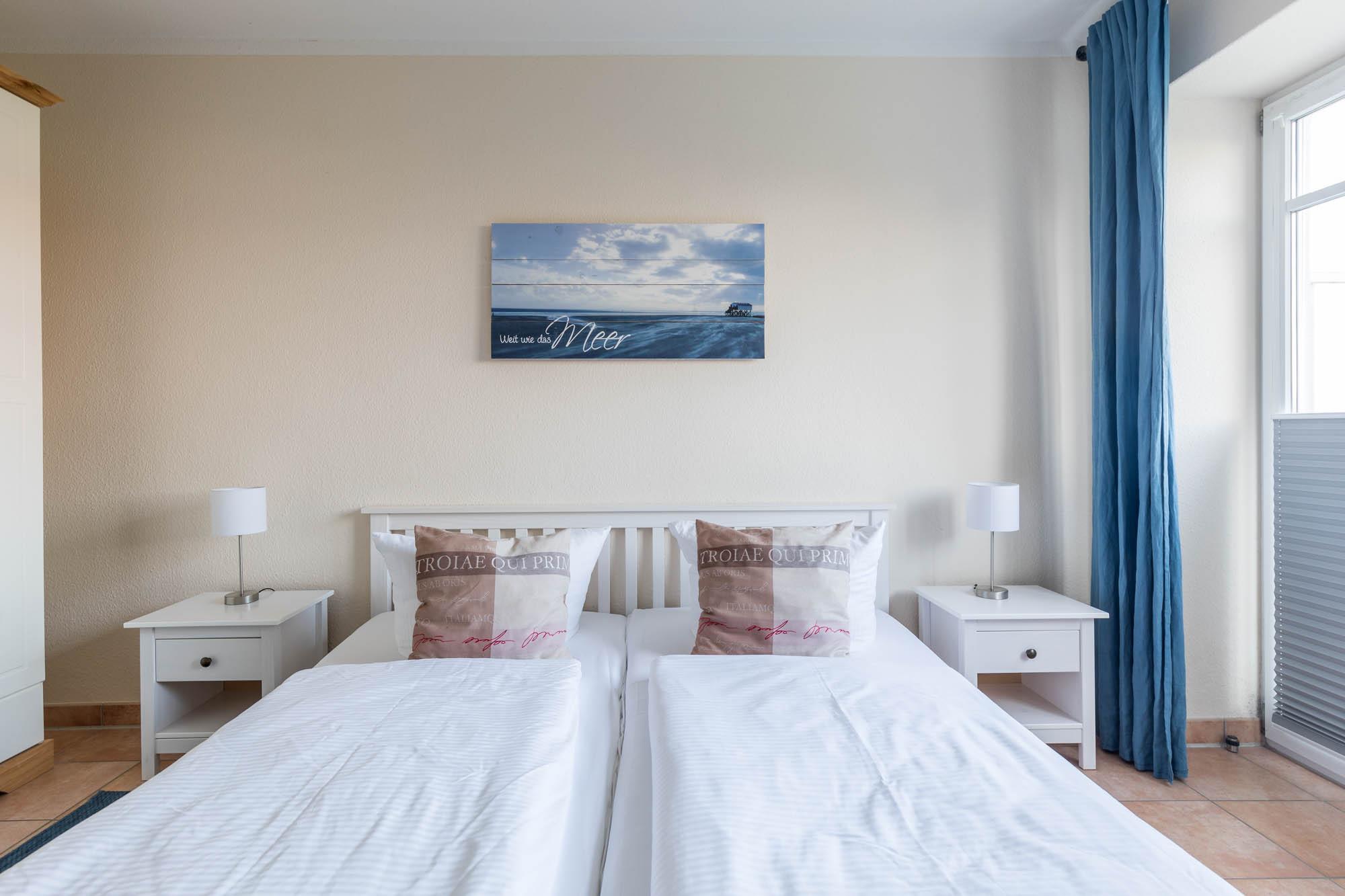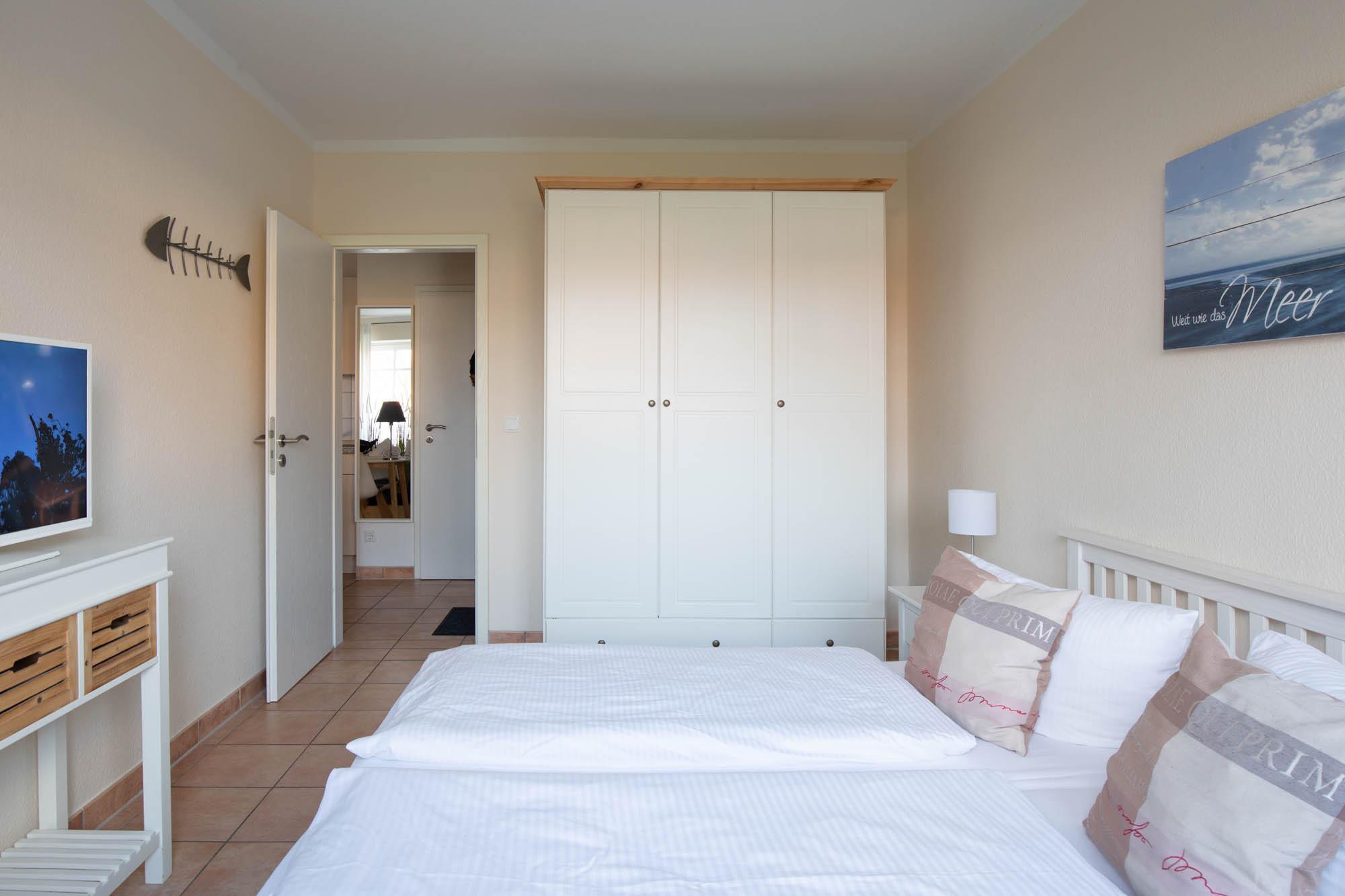 Das separate Schlafzimmer verwöhnt Sie mit dem bequemen Doppelbett und einem geräumigen Kleiderschrank für Ihre Urlaubsgarderobe. Für die Multimediaunterhaltung sorgt hier ebenfalls ein SAT-TV (Flatscreen).