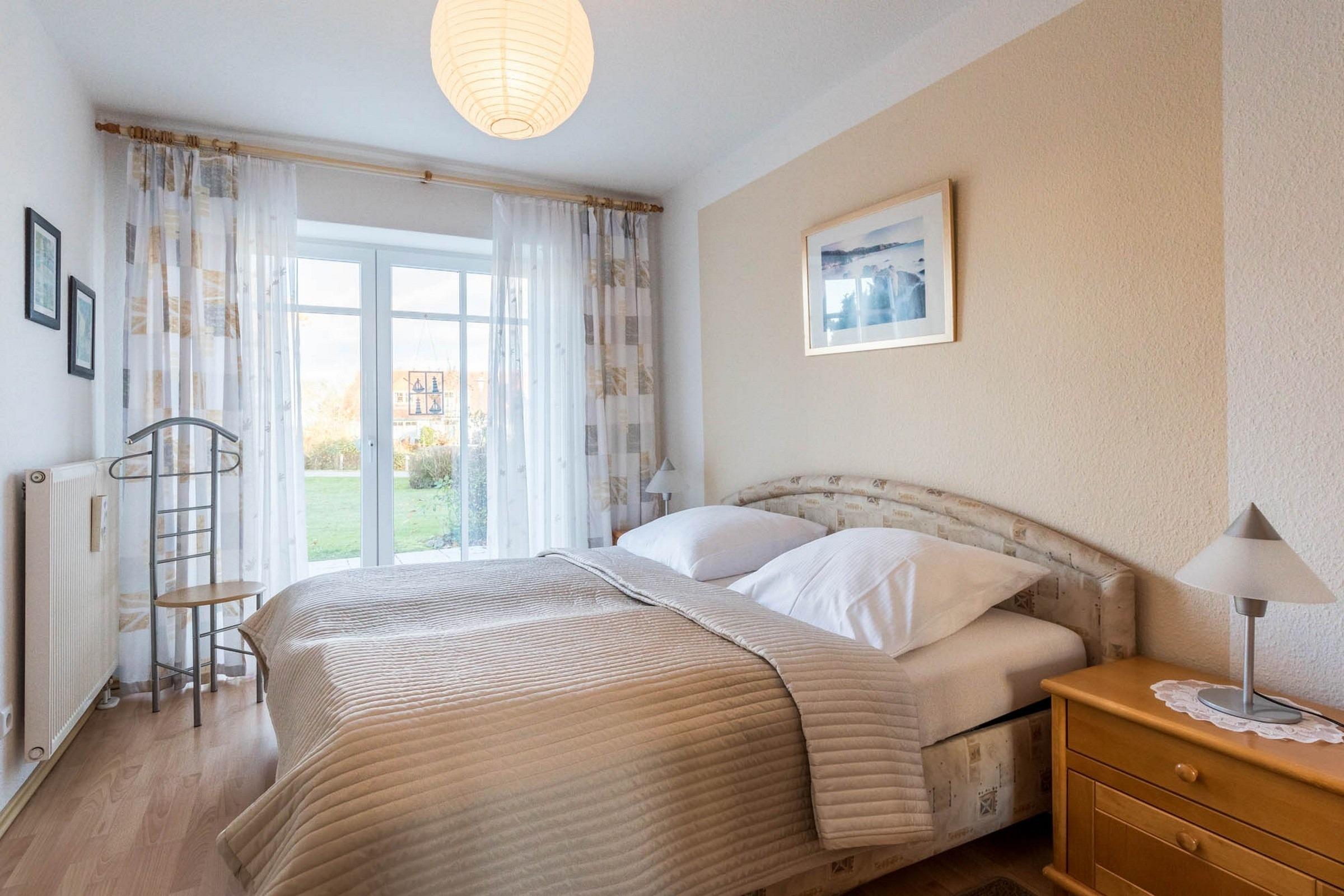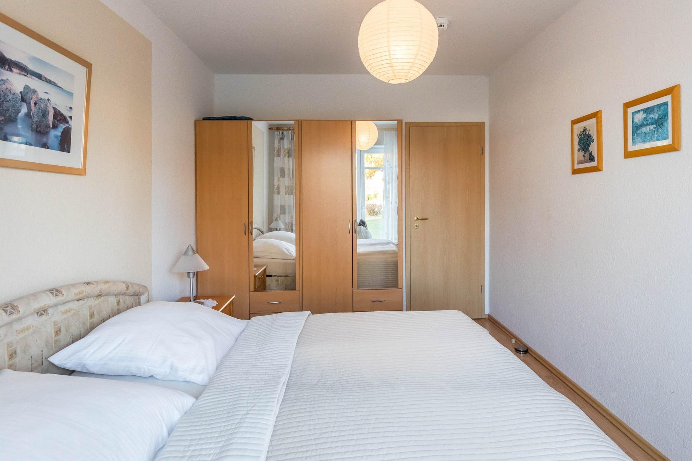 Das separate Schlafzimmer ist mit einem Doppelbett und einem Kleiderschrank ausgestattet. Hier gibt es auch Gardinen die für eine angenehme Dunkelheit sorgen.