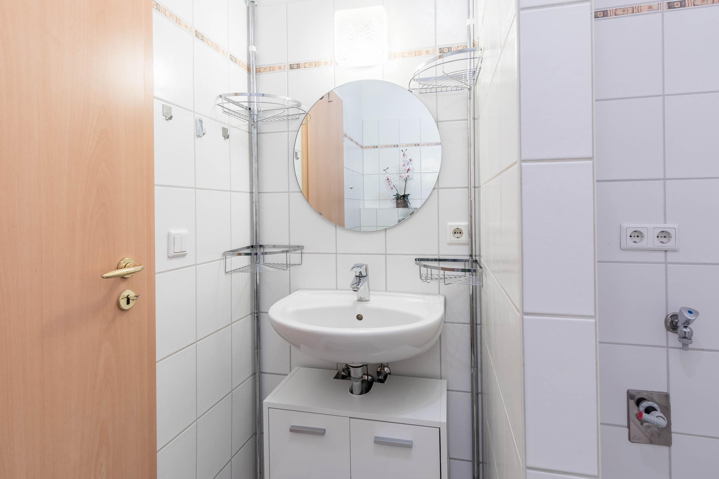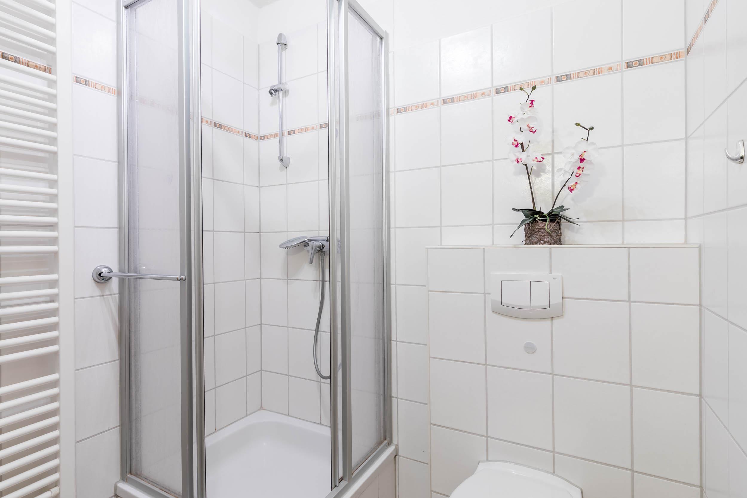 Im Bad mit Fußbodenheizung stehen Dusche, WC sowie ein Handtuchtrockner und ein Föhn zur Verfügung.