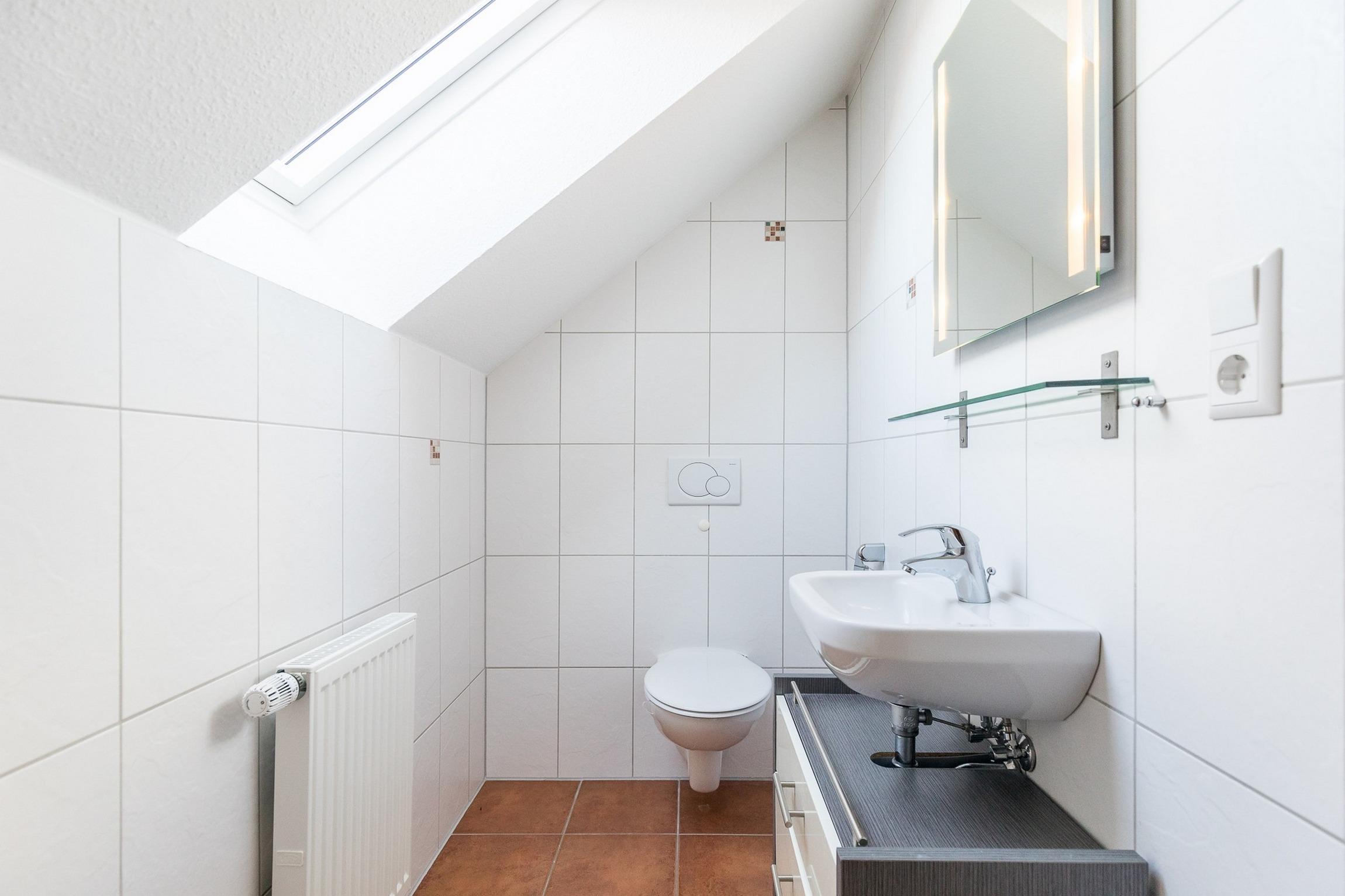In der 1.Wohnebene verfügt die familienfreundliche 4-Zimmer-Ferienwohnung im 1.OG, welche eine Ausstattung für 6 Personen bereithält, über eine offene Küche, einen gemütlichen Wohnbereich, ein Schlafzimmer mit zwei Einzelbetten und einem Kleiderschrank sowie über ein Badezimmer mit zwei Waschtischen und einer bodengleichen Dusche.