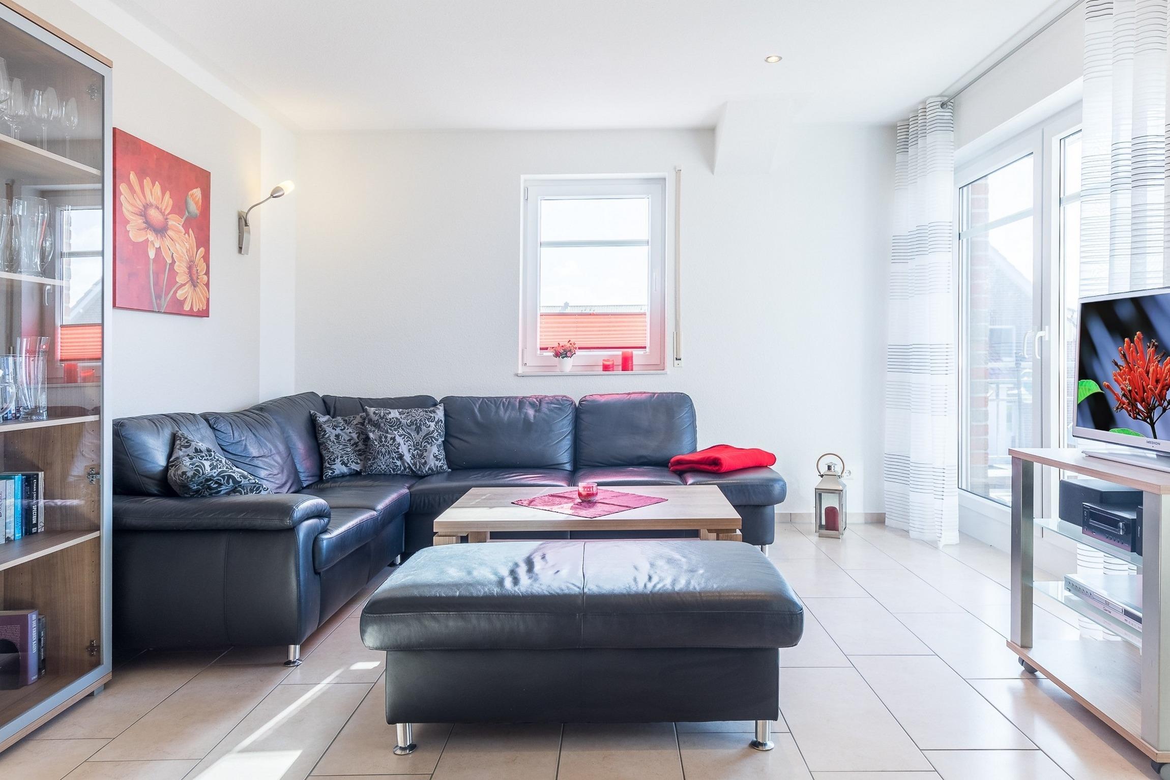 Der moderne Wohnbereich lädt mit einer bequemen Wohnlandschaft und einem großen SAT-TV (Flatscreen) zum Entspannen ein. Von hier aus gelangen Sie auch auf den möblierten Südbalkon mit Sonnenschirm.
