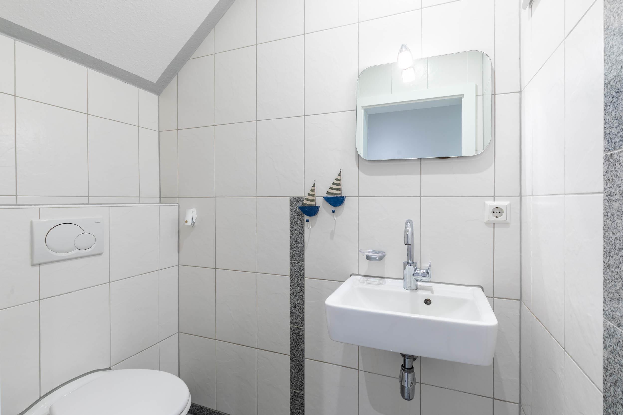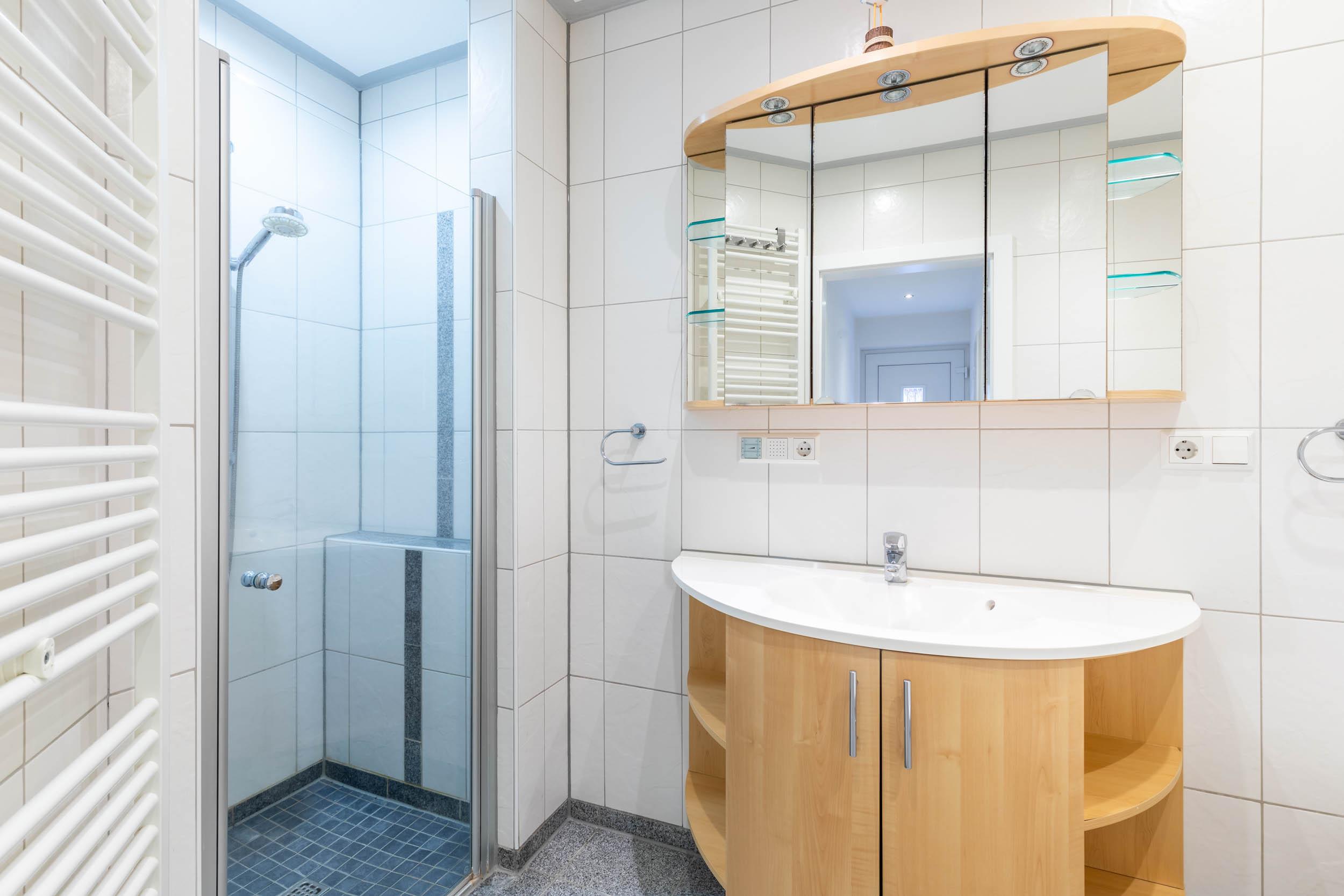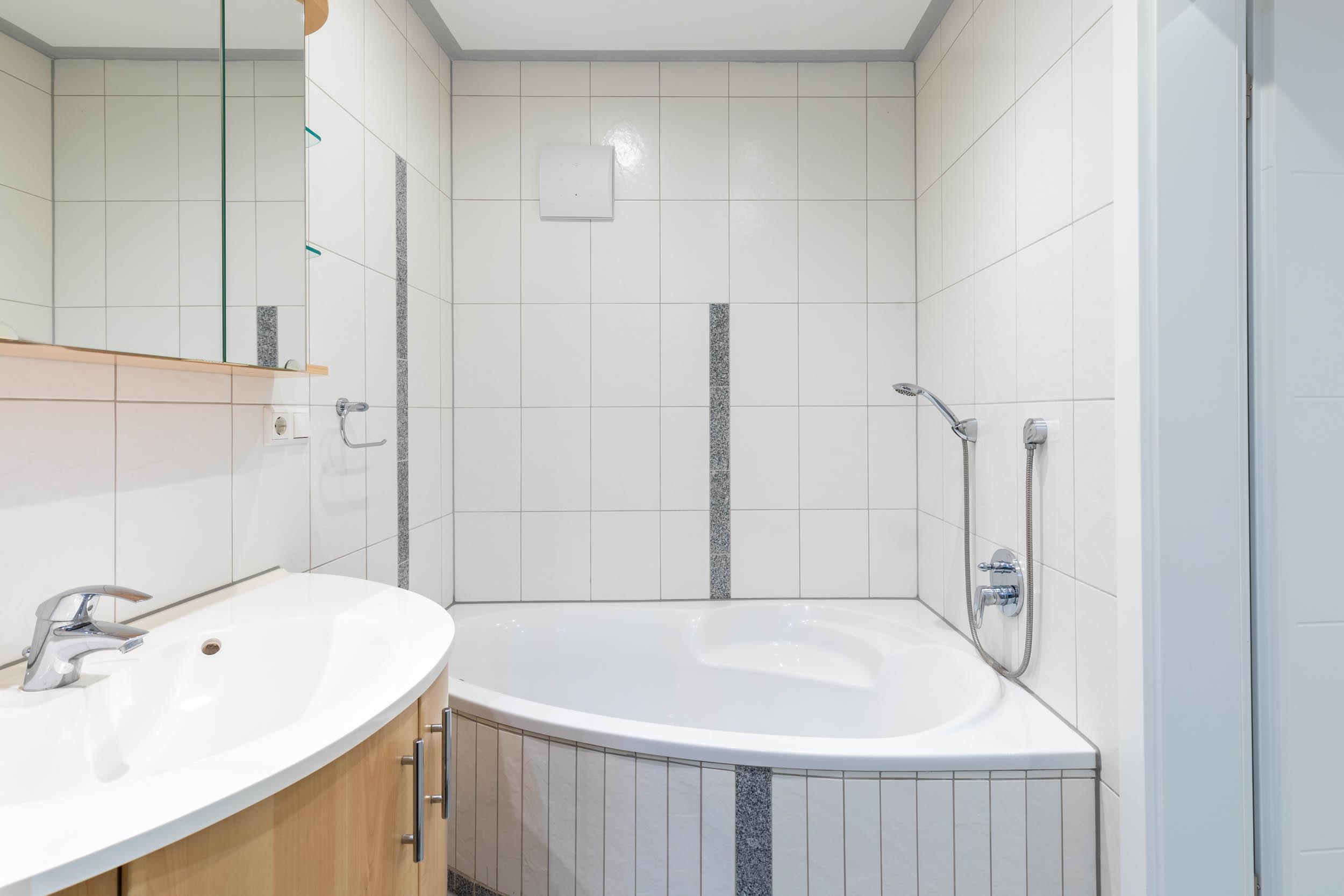 Das Badezimmer ist nicht nur mit einer Dusche, sondern zusätzlich mit einer Eckbadewanne ausgestattet. Praktischerweise gibt es ein separates WC.