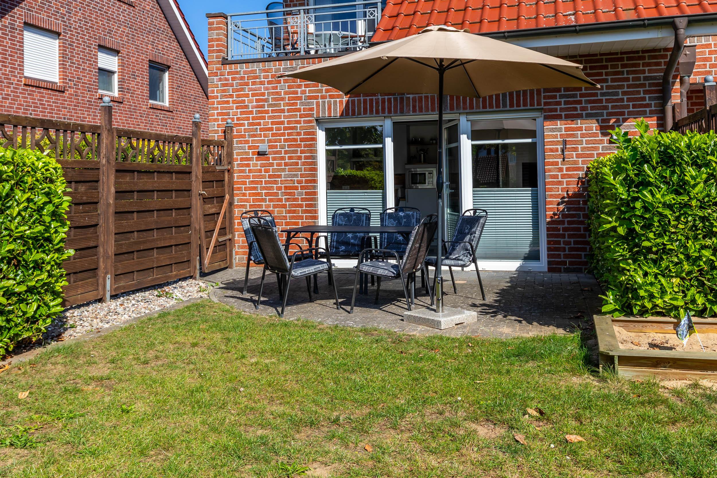 Zur Wohnung gehört eine Terrasse mit Gartenmöbeln und Garten.