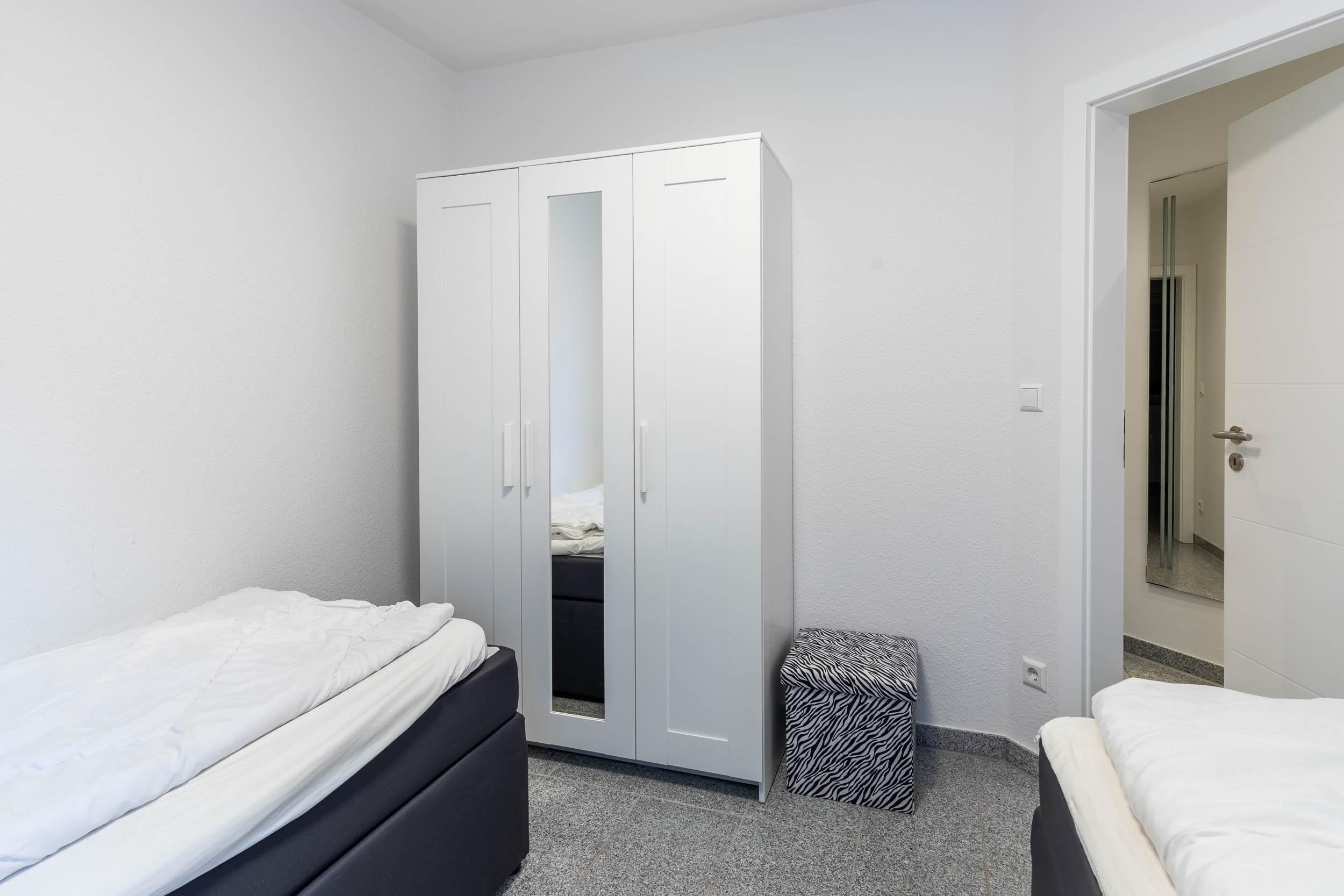 Im Schlafzimmer findet man ein gemütliches Doppelbett und TV mit integriertem DVD-Player, das Gästezimmer bietet zwei Einzelbetten. Beide Zimmer bieten auch einen Kleiderschrank.