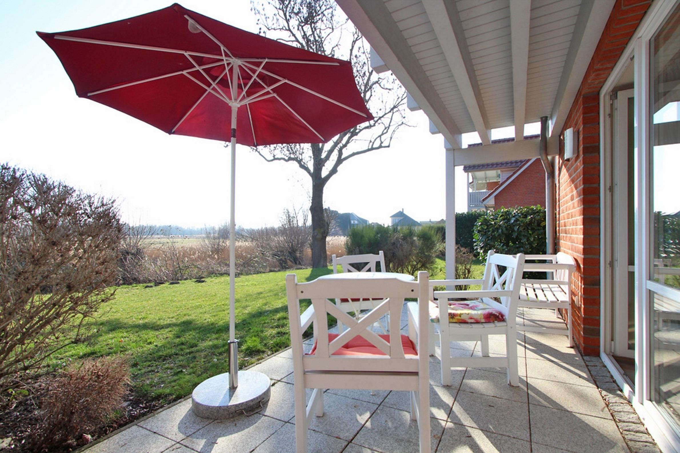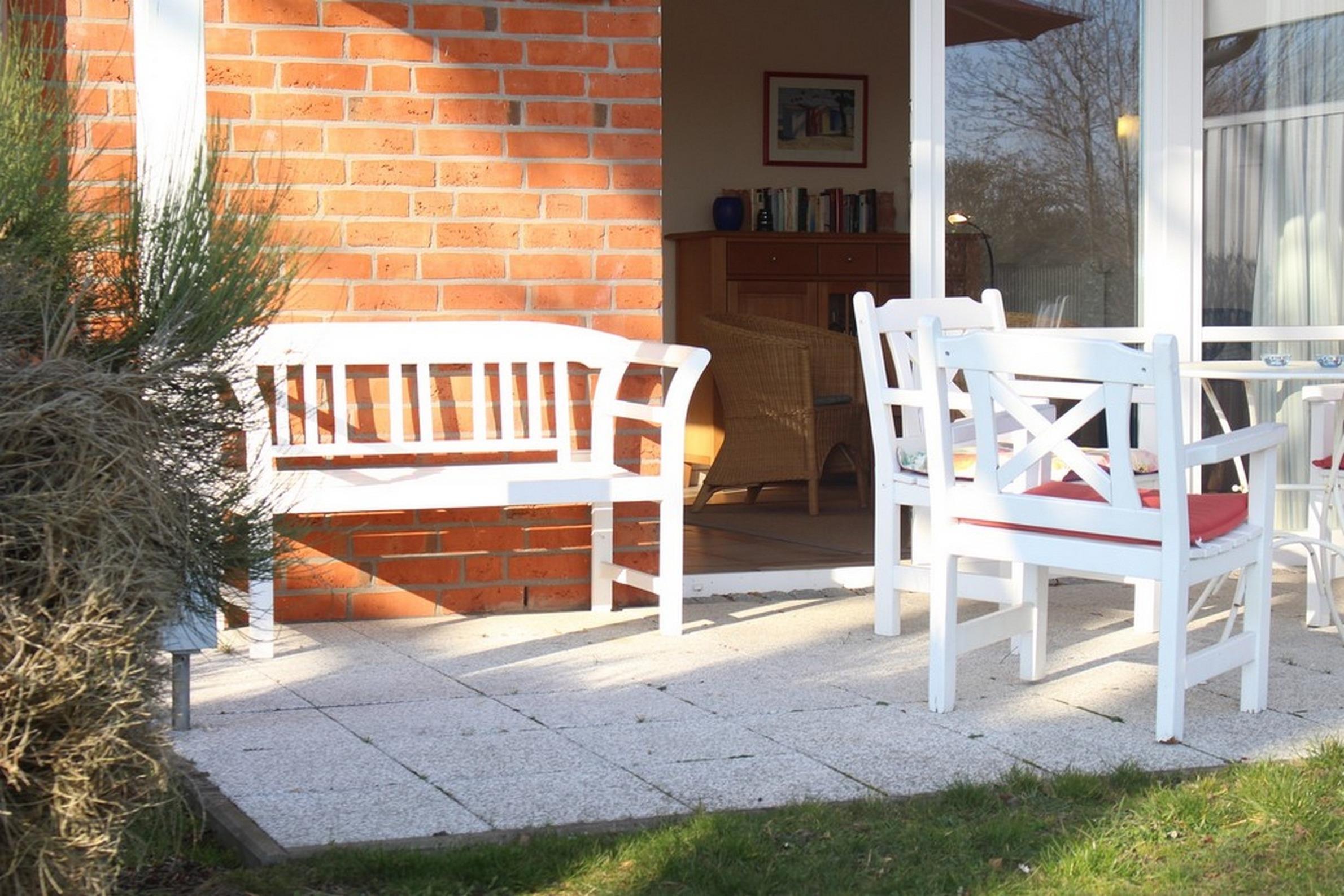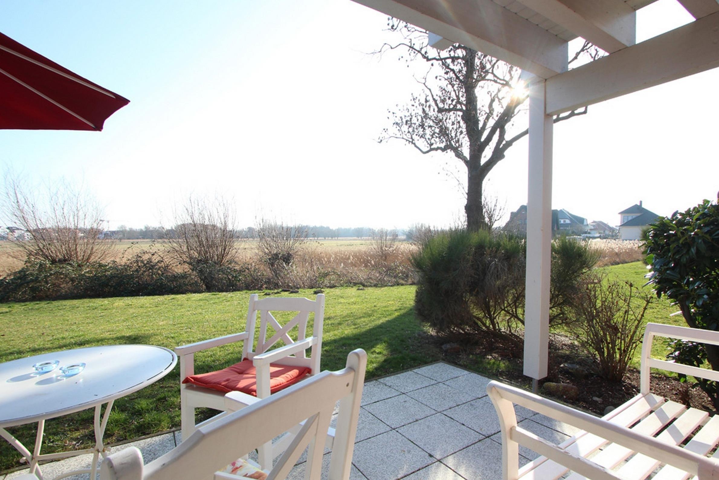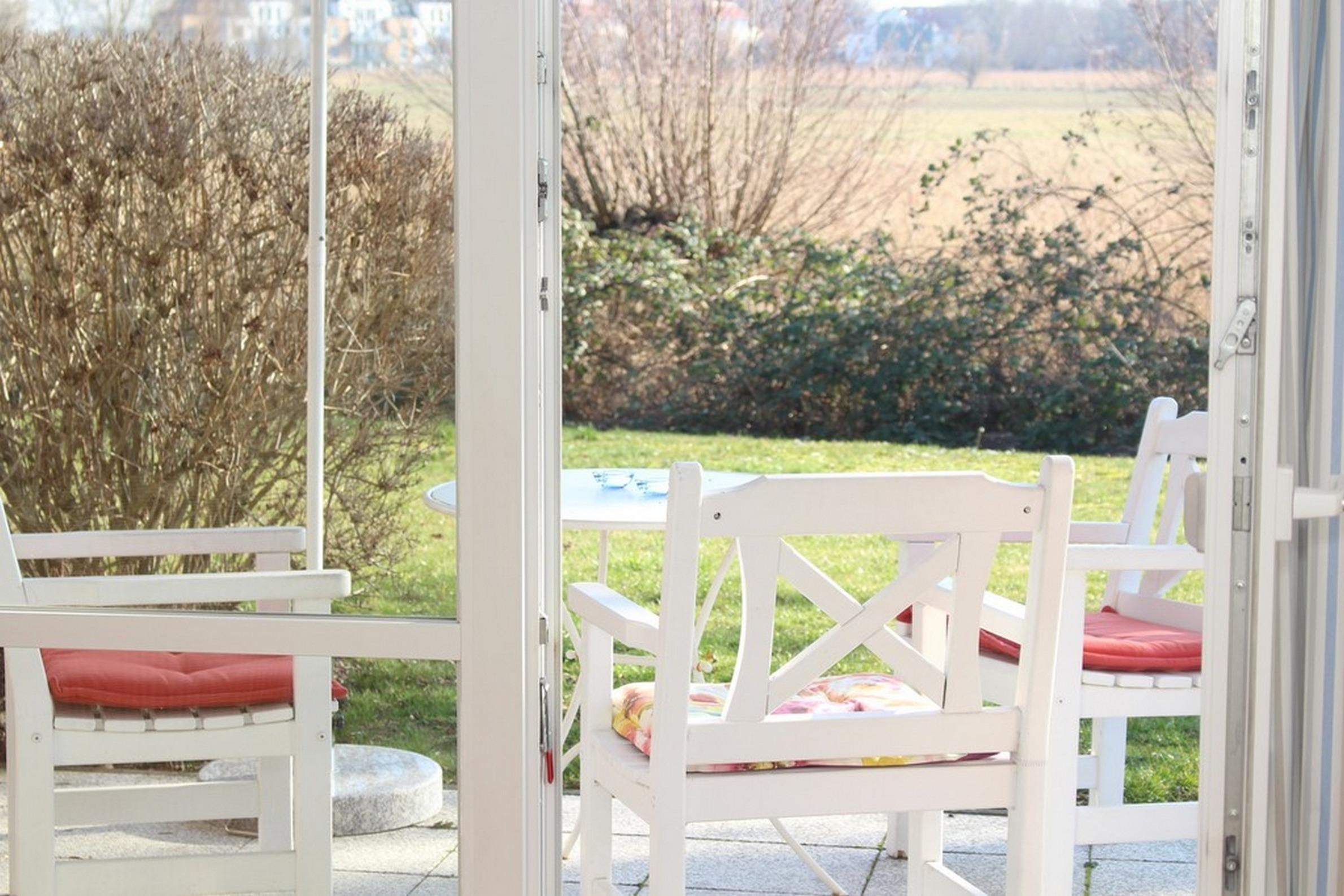 Die möblierte Südterrasse, welche Sie vom Wohnzimmer aus erreichen, bietet einen unvergesslichen Blick auf das Haff.
