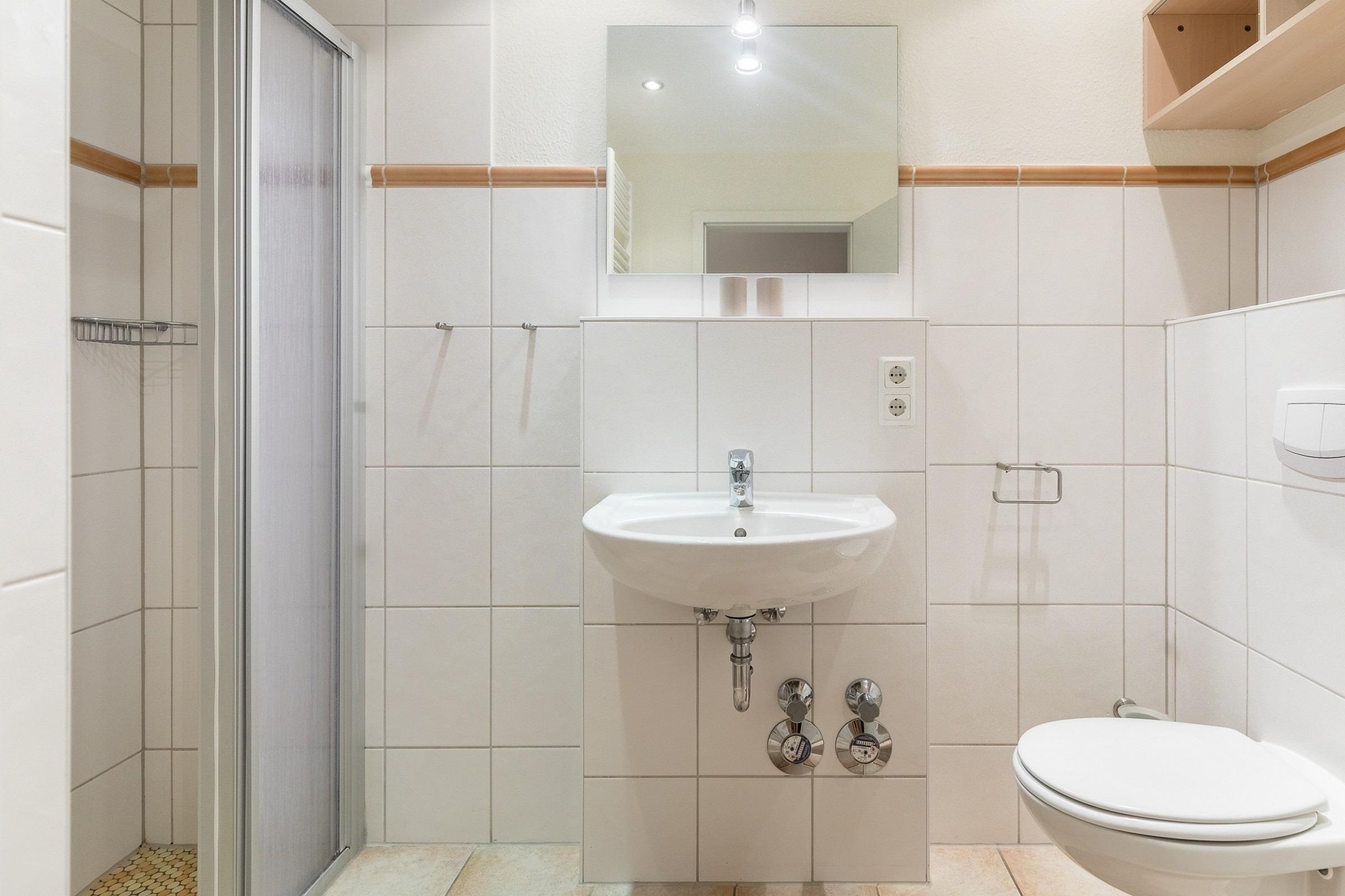 Ein modern gestaltetes Badezimmer mit Dusche und WC komplettiert die Ferienwohnung.