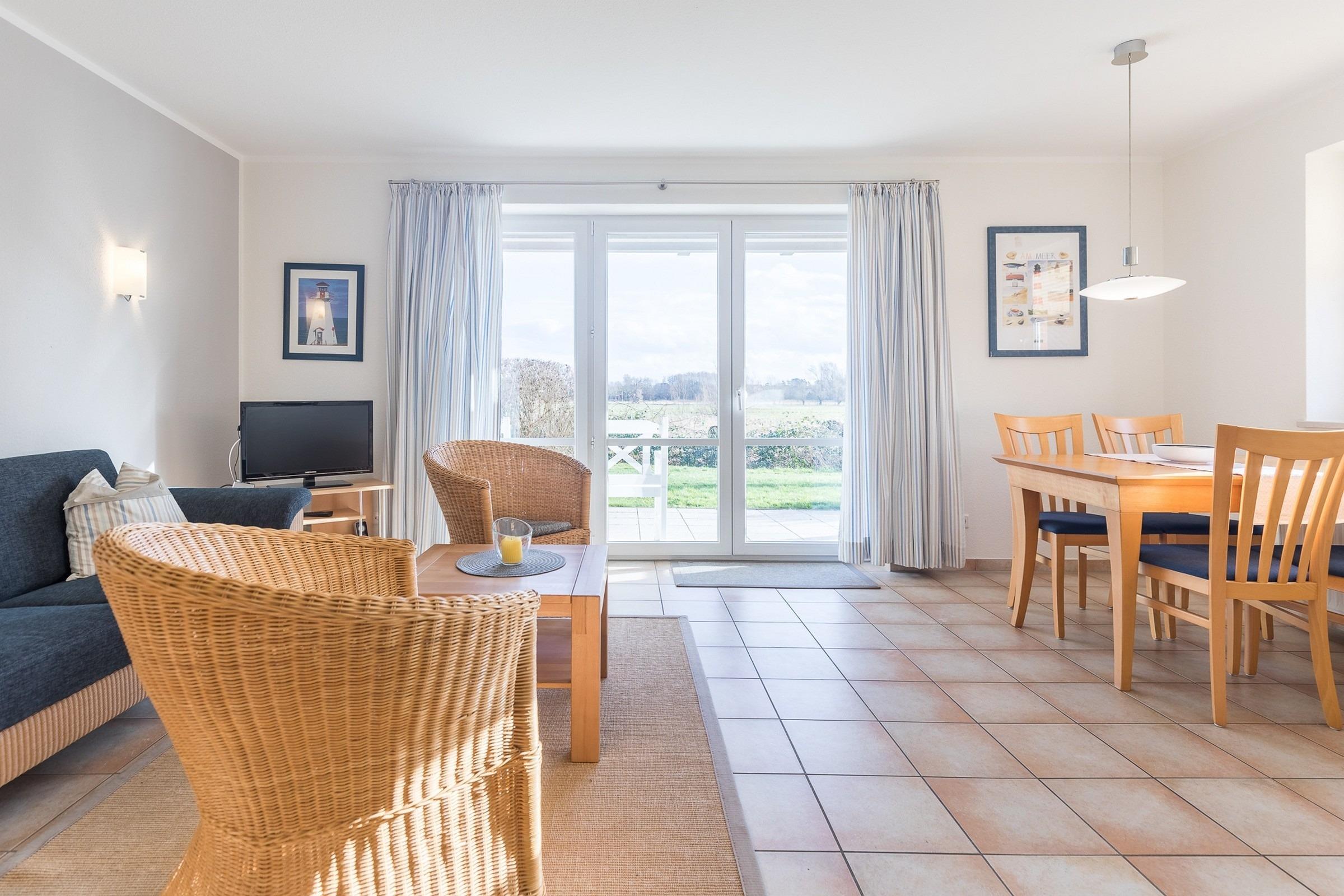 Die 3-Zimmer-Ferienwohnung im Erdgeschoss bietet eine tolle Ausstattung bis 4 Personen. So verfügt sie über einen stilvoll eingerichteten Wohnbereich mit integrierter Wohnküche und angeschlossener Essecke. Eine Couchgarnitur und der moderne Smart-TV sorgen für Gemütlichkeit und Unterhaltung im Wohnbereich, während die offene Küche mit einer komfortablen Ausstattung für eine sorglose Selbstverpflegung glänzt. An der Essecke können Sie gern Ihre Speisen bequem einnehmen, Ihre Urlaubspost schreiben oder auch einen schönen Spieleabend verbringen.