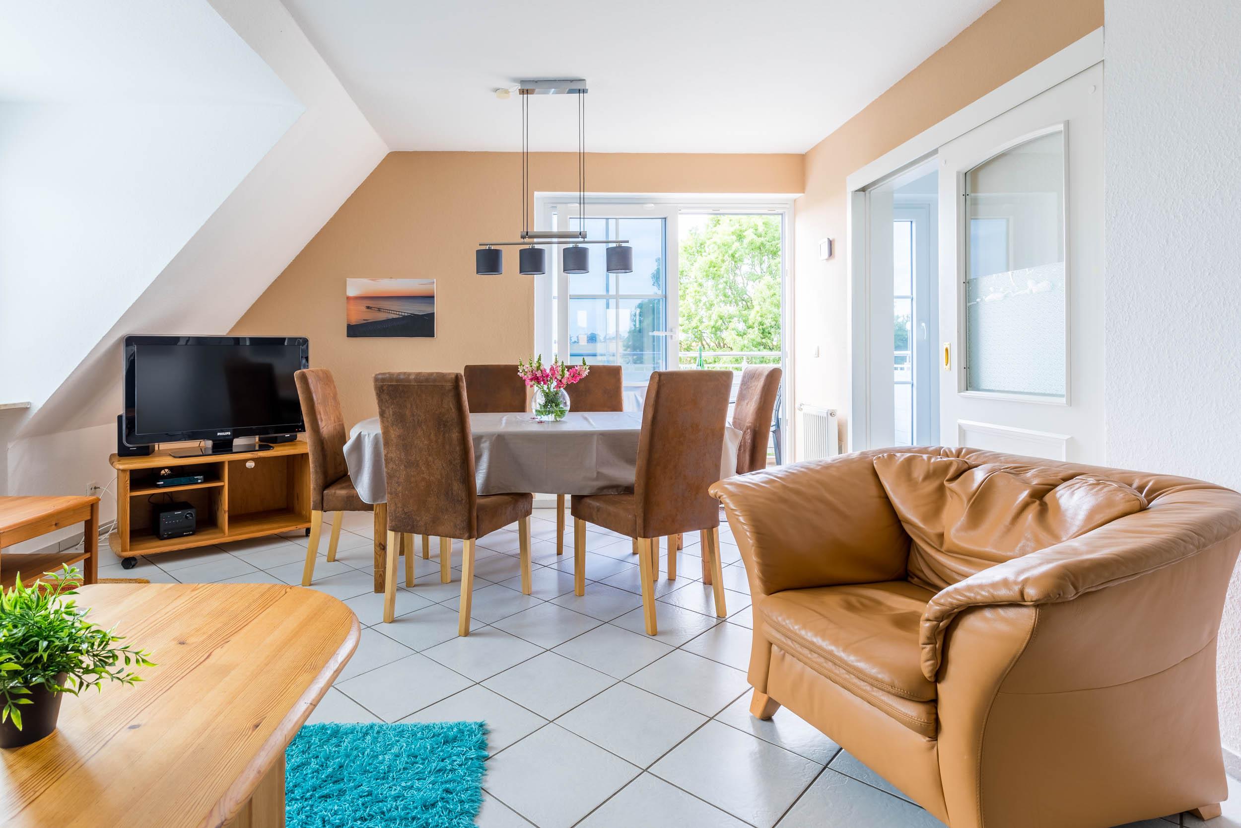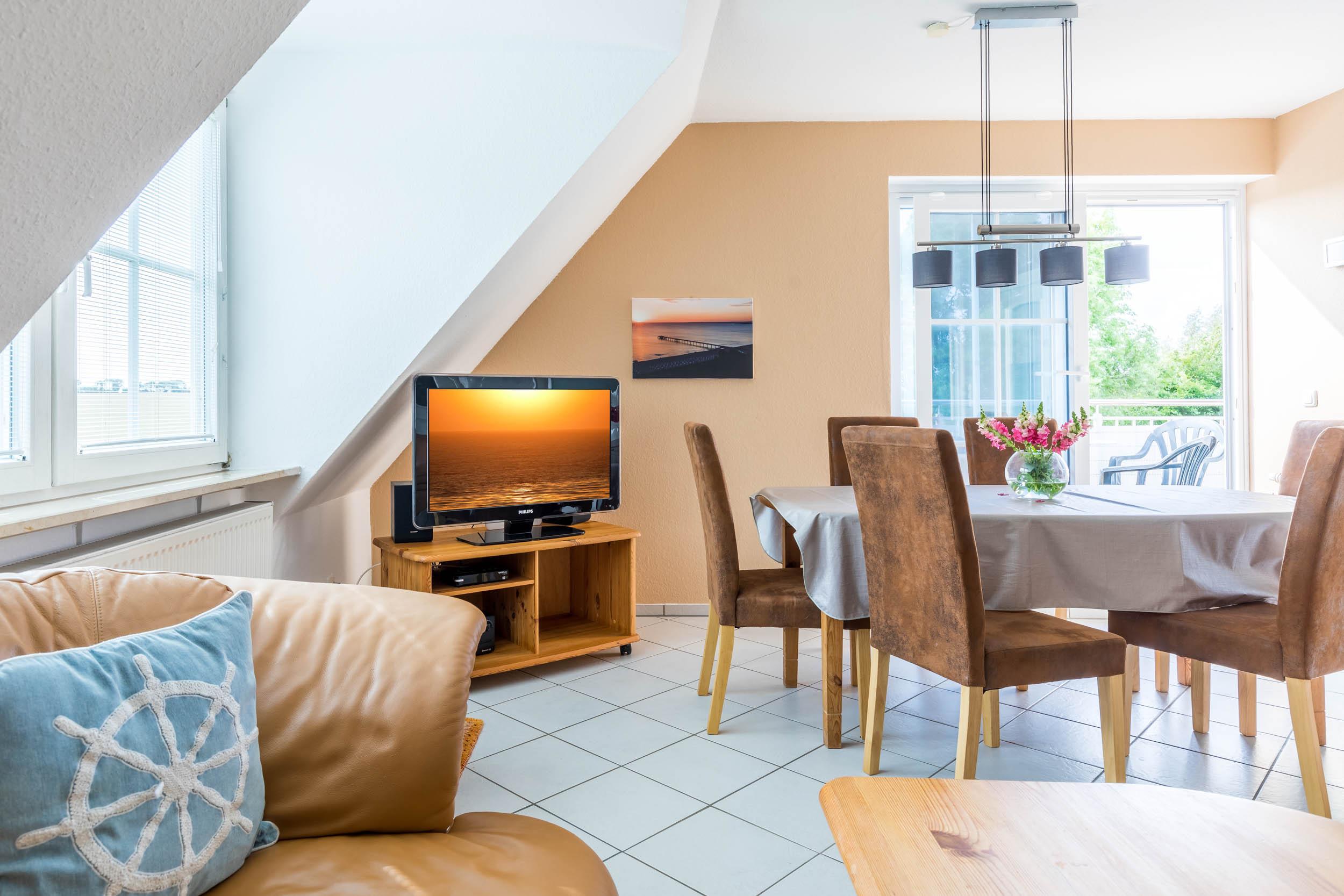 Die 80 Quadratmeter große 3-Zimmer-Komfortferienwohnung an der Ostsee liegt im Dachgeschoss und geht über zwei Wohnebenen. Es ist eine komfortabel eingerichtete Ferienwohnung mit einer Ausstattung für 5 Gäste plus Kleinkind.