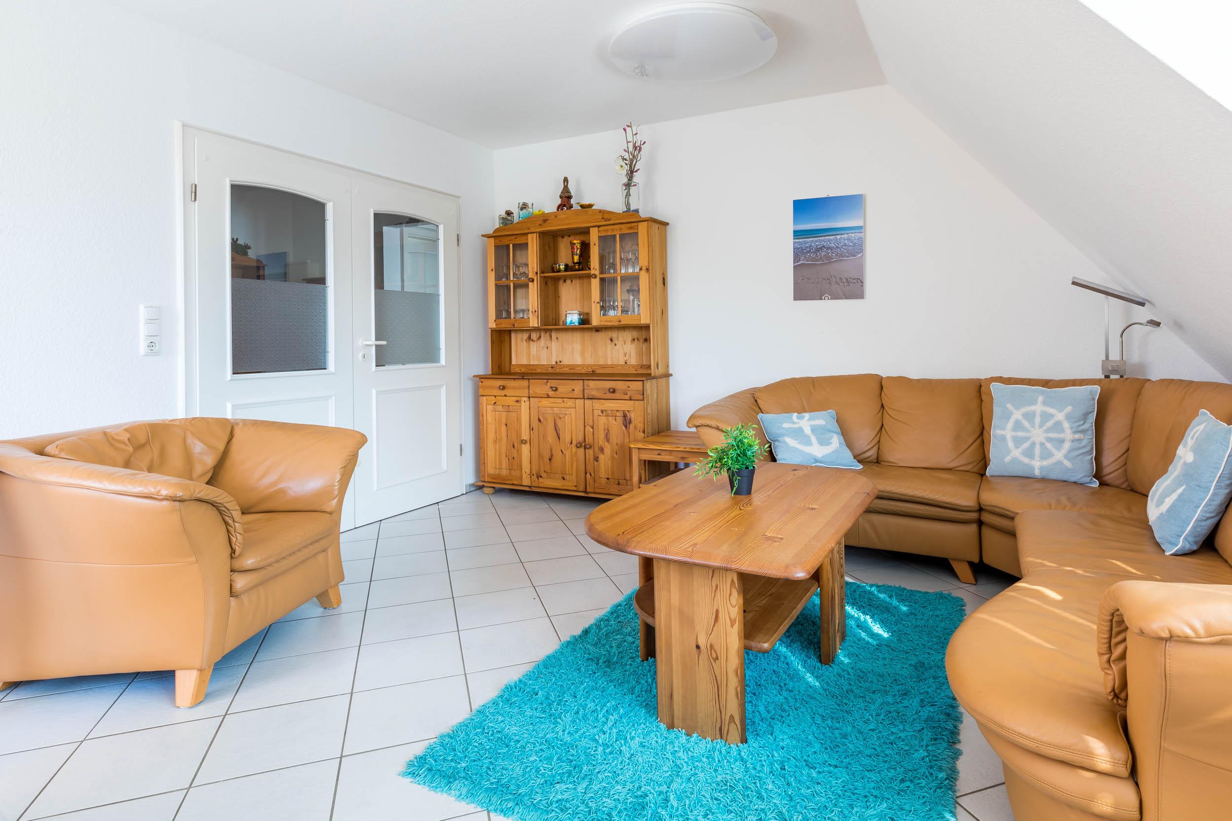 Der gemütliche Wohnbereich in erster Wohnebene ist mit einer Couchgarnitur, SAT-TV und einer separaten Essecke ausgestattet.
