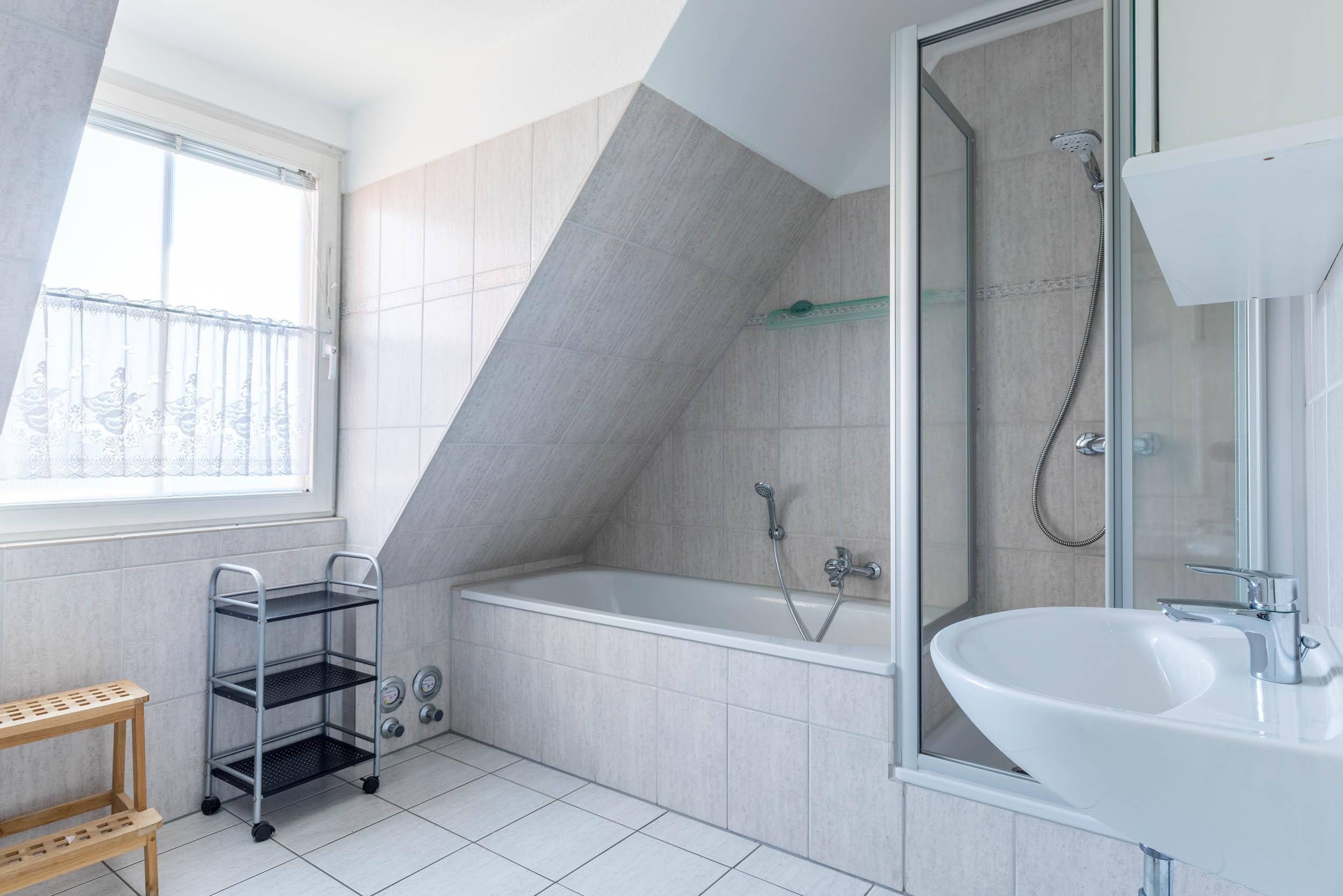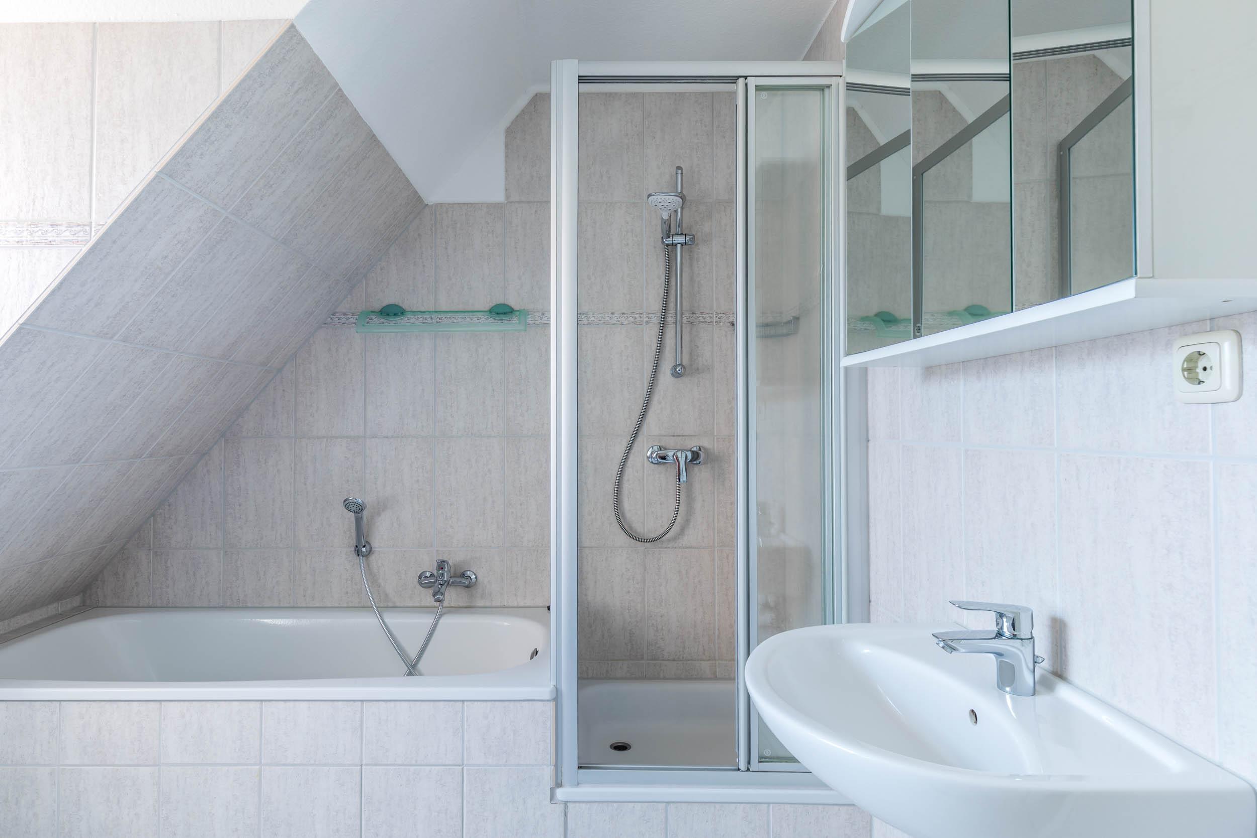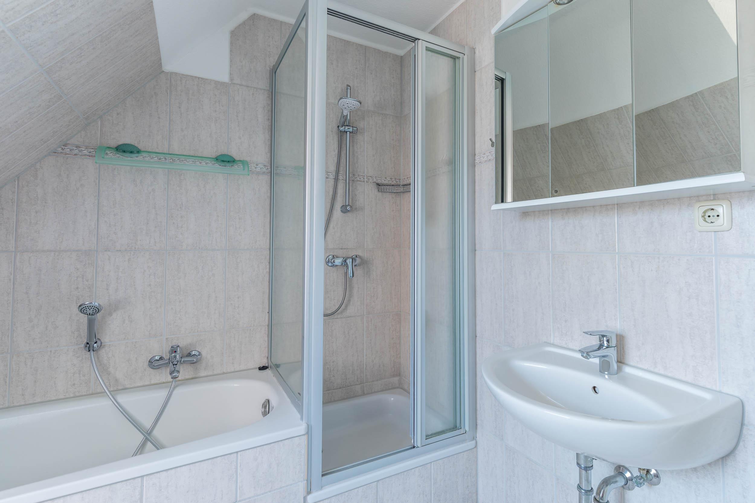 Das Bad ist als Vollbad mit Badewanne und Dusche konzipiert.