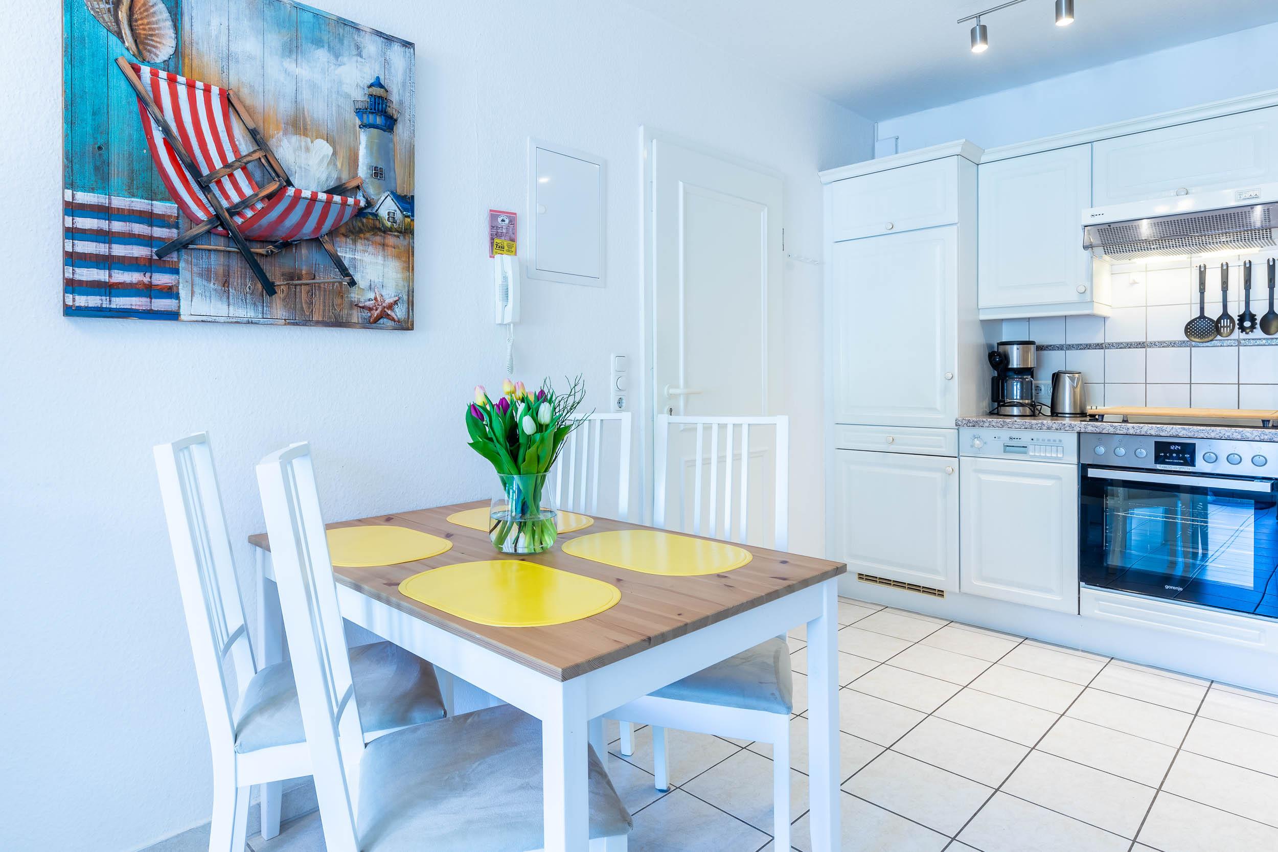 Die moderne Küchenzeile ist mit beliebten Technikgeräten wie Geschirrspüler, Mikrowelle und Kühlschrank ausgestattet. Auch Kleingeräte und typisches Küchenzubehör wie Geschirr, Besteck und Töpfe sind vorhanden.
