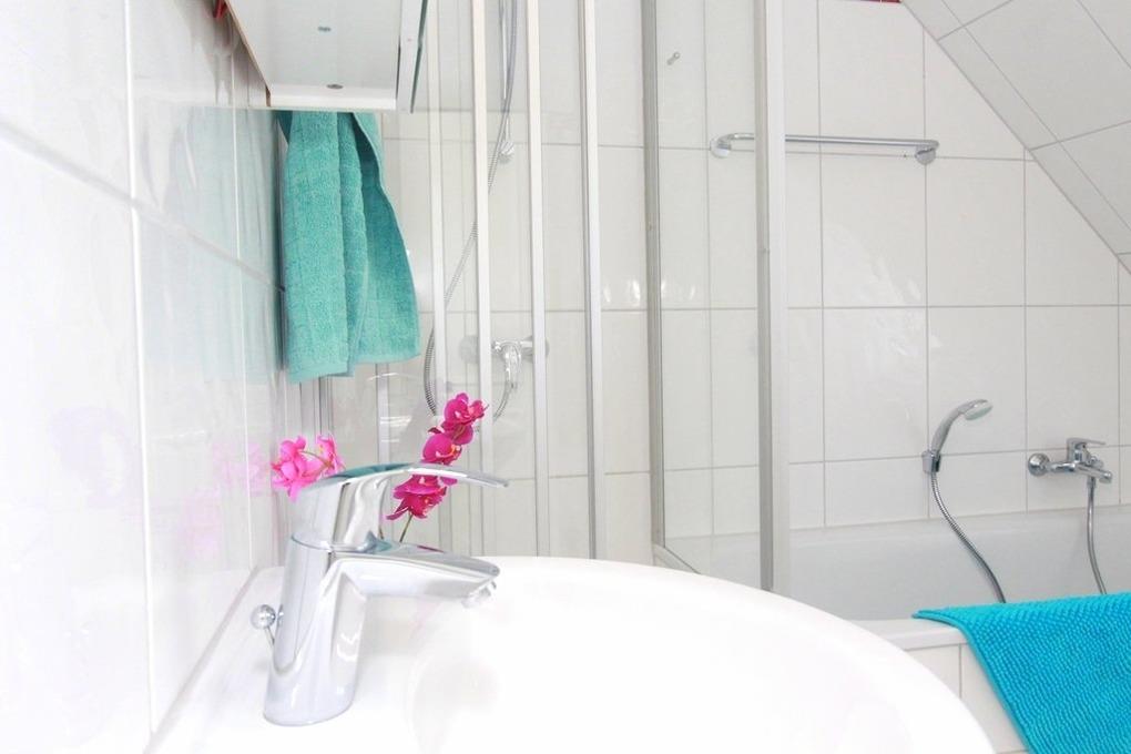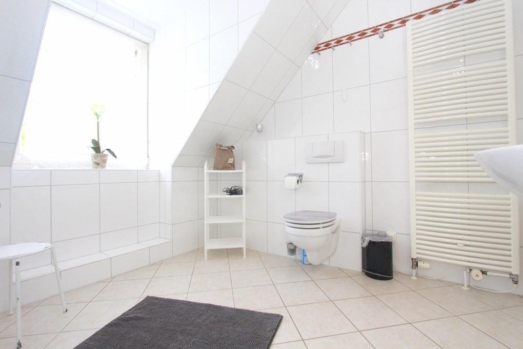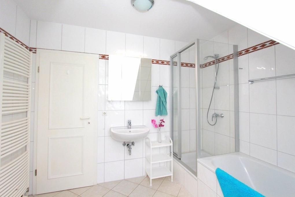 Das großzügig geschnittene Badezimmer bietet sowohl Dusche als auch natürlich Badewanne und ein WC.