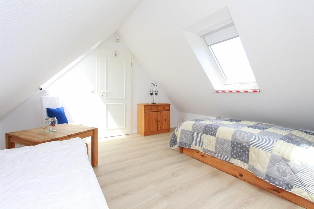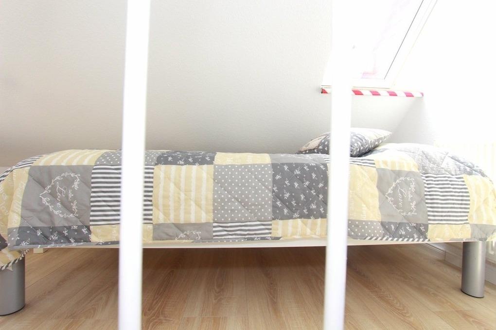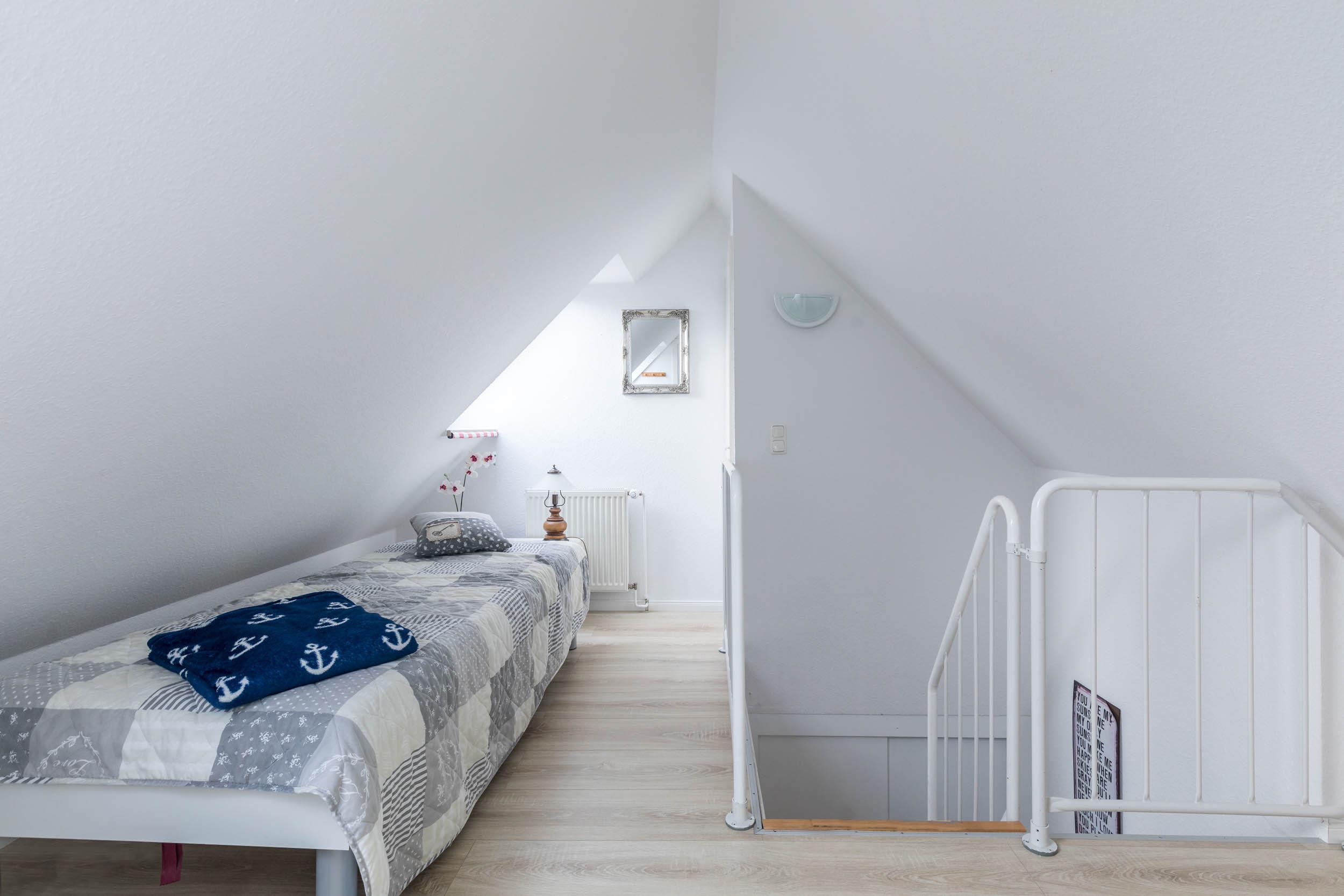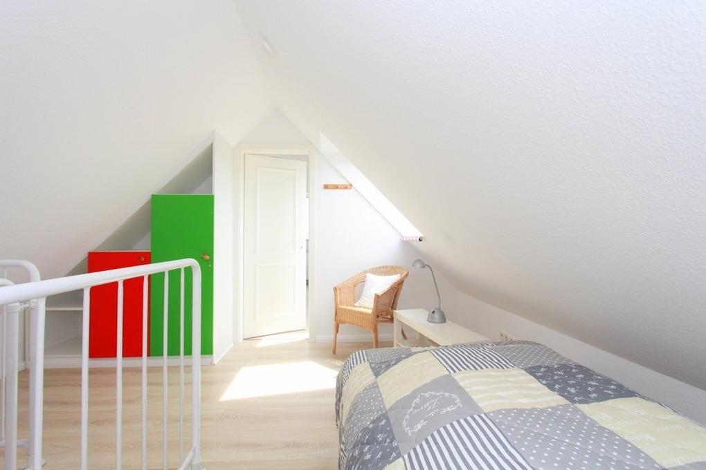 In der zweiten Wohnebene, im Dachgeschoss befindet sich in der offenen Schlafgalerie ein zusätzliches Einzelbett. Anschließend gelangen Sie in das Kinder-/ Gästezimmer, welches mit zwei Einzelbetten eingerichtet ist. Für Ihre Ablage dient hier eine Kommode.