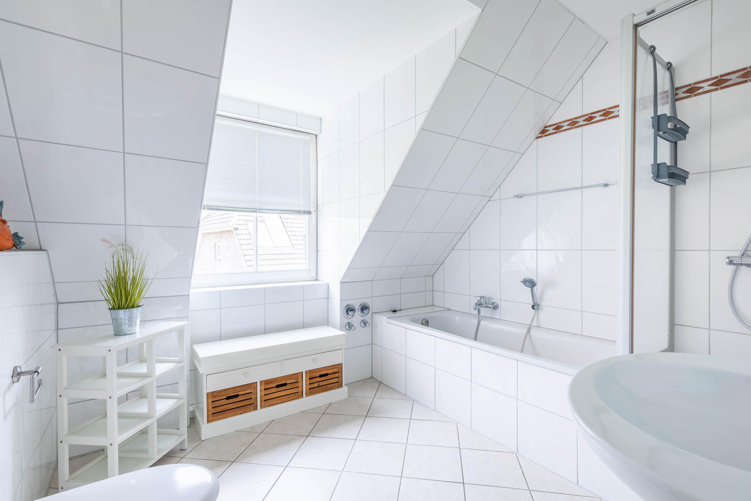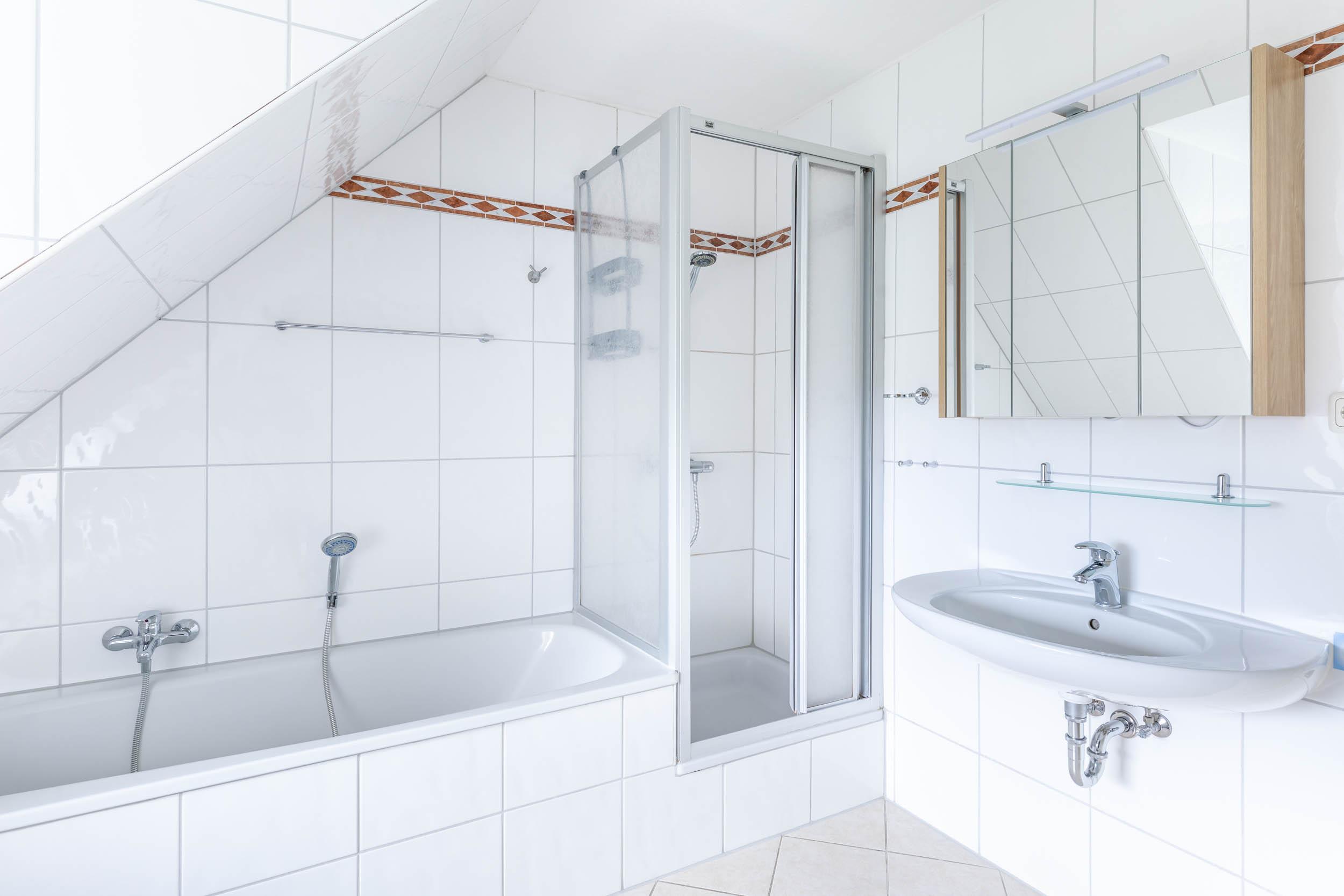 Das helle Tageslichtbad überzeugt mit: Dusche, Badewanne, WC. Perfekt zum Entspannen nach einem erlebnisreichen Tag.