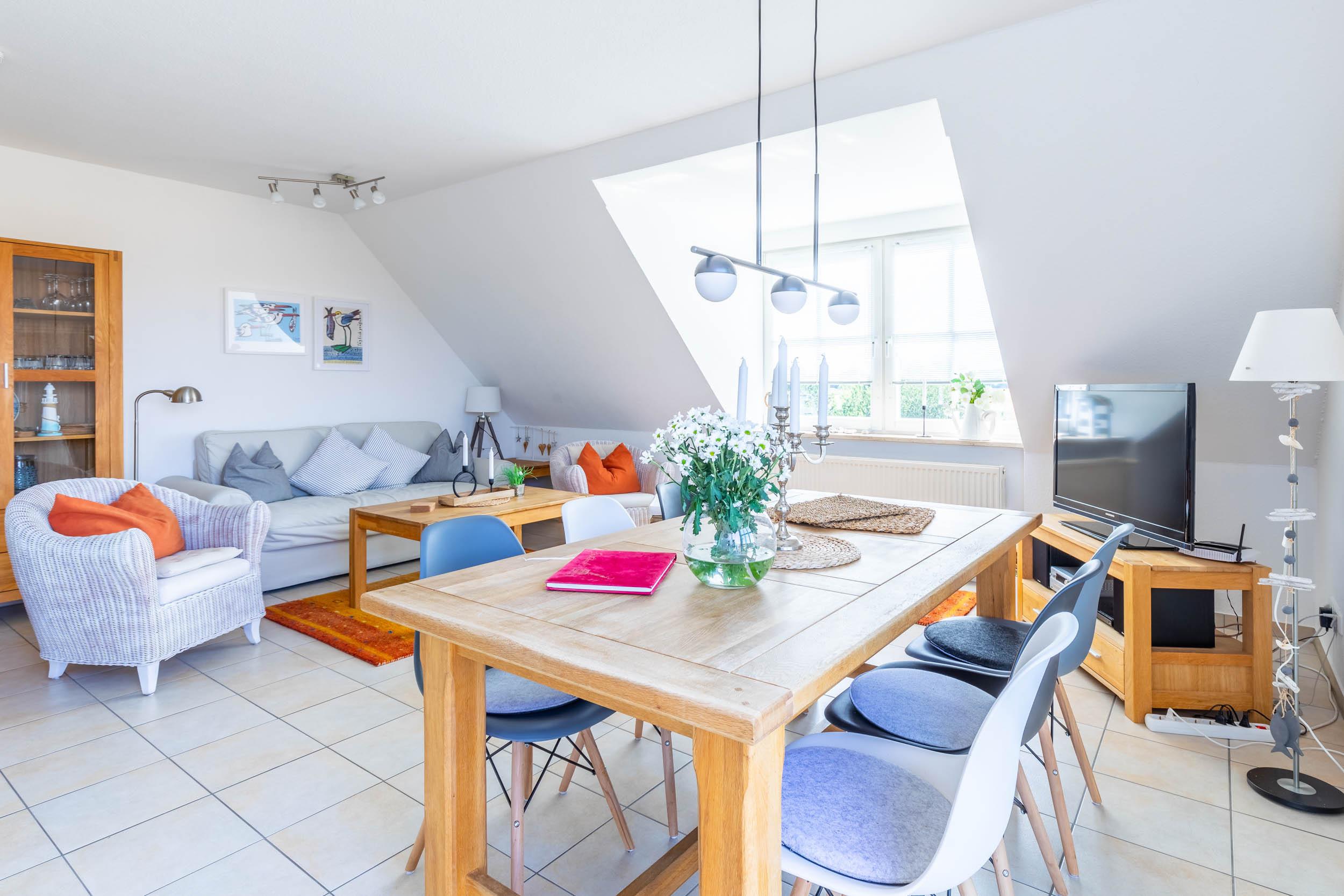 In der ersten Wohnebene befindet sich ein großer Wohnbereich mit einer Schlafcouch für 2 Personen und Flatscreen-TV. Hier kann - neben dem Satellitenfernsehen - das TV-Programm alternativ auch über den Streamingdienst Waipu gestreamt werden. An der Essecke finden alle Gäste Platz, um z.B. die Mahlzeiten einnehmen zu können.